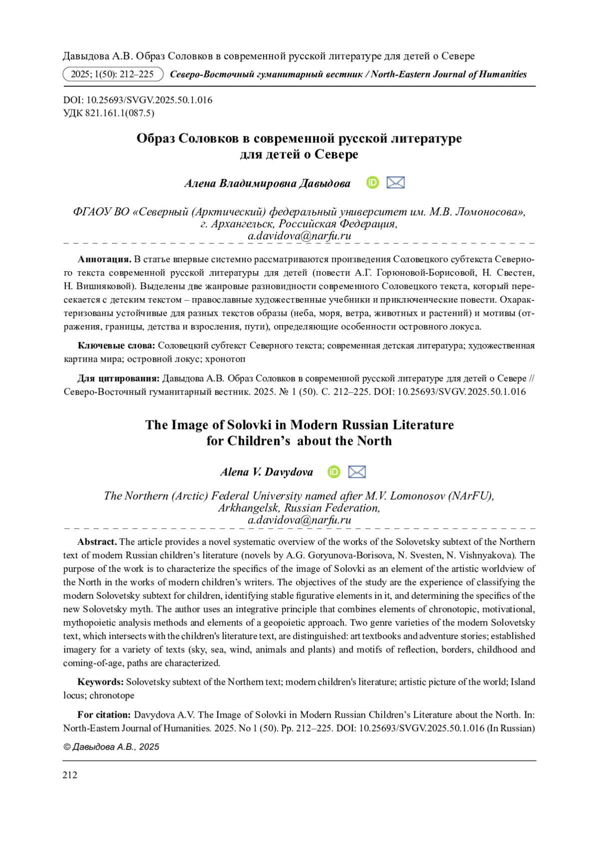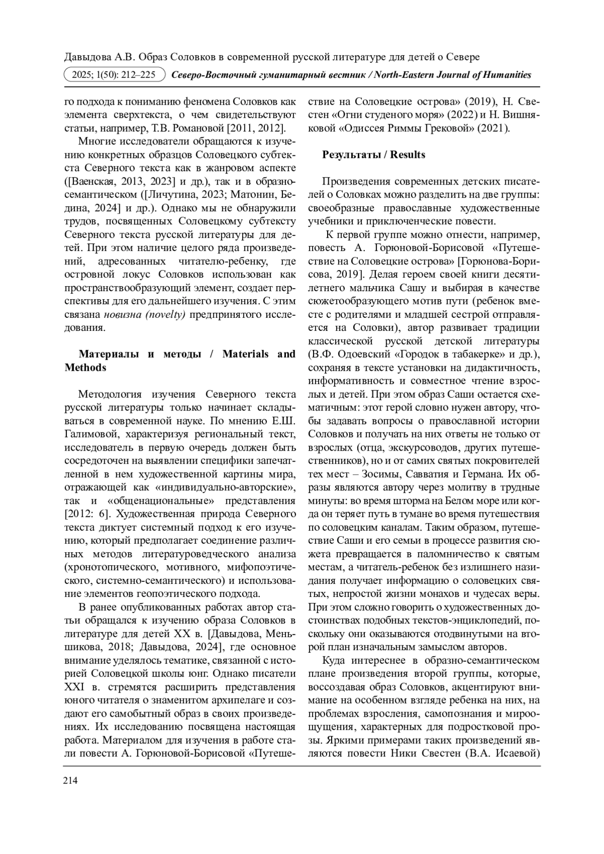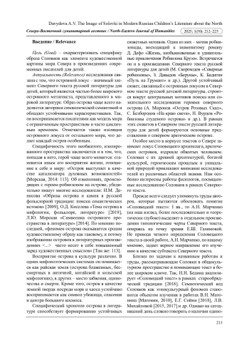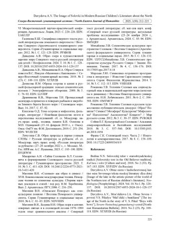 7. Давыдова А.В. Образ озера в художественной картине мира Северного текста русской литературы для детей // Неофилология. 2024. Т. 10. № 1. С. 128-137. DOI: 10.20310/2587-6953-2024-10-1-128-137 EDN: LYGEPQ