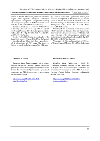 В статье впервые системно рассматриваются произведения Соловецкого субтекста Северного текста современной русской литературы для детей (повести А. Г. Горюновой-Борисовой, Н. Свестен, Н. Вишняковой). Выделены две жанровые разновидности современного Соловецкого текста, который пересекается с детским текстом - православные художественные учебники и приключенческие повести. Охарактеризованы устойчивые для разных текстов образы (неба, моря, ветра, животных и растений) и мотивы (отражения, границы, детства и взросления, пути), определяющие особенности островного локуса.