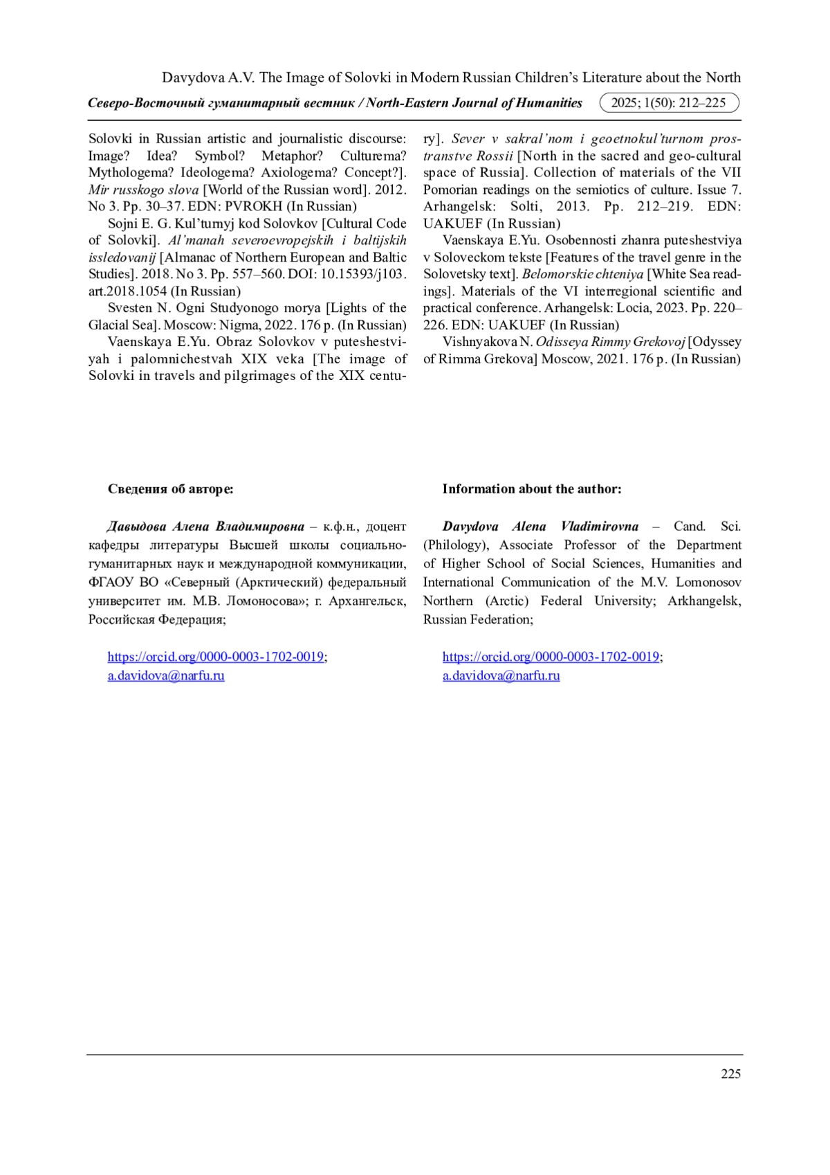 17. Михайлова Л.В. Семиотическое культурное пространство Соловков // Вестник Северного (Арктического) федерального университета. Серия: гуманитарные и социальные науки. 2015. № 3. С. 126-132. Михайлова Л.В. Семиотическое пространство культуры Русского Севера // Знание. Понимание. Умение. 2017. № 4. С. 156-176. DOI: 10.17805/zpu.2017.4.14 EDN: UIJTCL