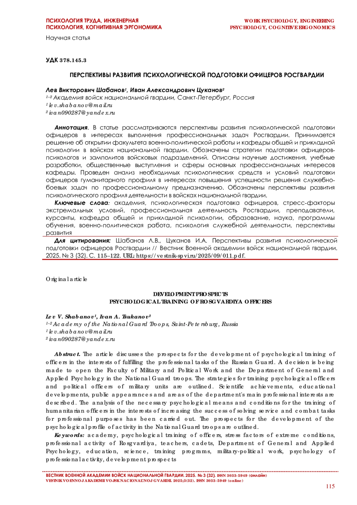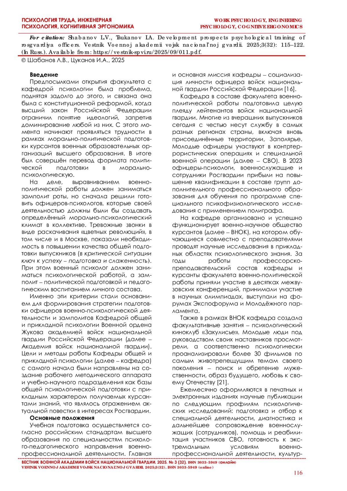 Настоящая статья посвящена актуальной проблеме психофизиологического обеспечения военнослужащих войск национальной гвардии Российской Федерации, выполняющих задачи в условиях специальной военной операции [1]. Рассматриваются основные вызовы и особенности психофизиологического состояния военнослужащих, подвергающихся экстремальным нагрузкам боевого стресса. Анализируются существующие подходы к оказанию медицинской и психологической помощи, а также предлагаются пути совершенствования системы психофизиологического обеспечения с учетом специфики зоны боевых действий. Также в статье рассмотрена организация и методика психофизиологического сопровождения военнослужащих войск национальной гвардии Российской Федерации, выполнявших служебно-боевые задачи экстремального характера. Представлен комплекс мероприятий психофизиологического сопровождения, который включает психофизиологическое изучение, углубленное психологическое и психофизиологическое обследование военнослужащих, мероприятия по оказанию им психофизиологической помощи и психологической поддержки в процессе военнопрофессиональной деятельности, а также коррекции нарушенных функциональных состояний.