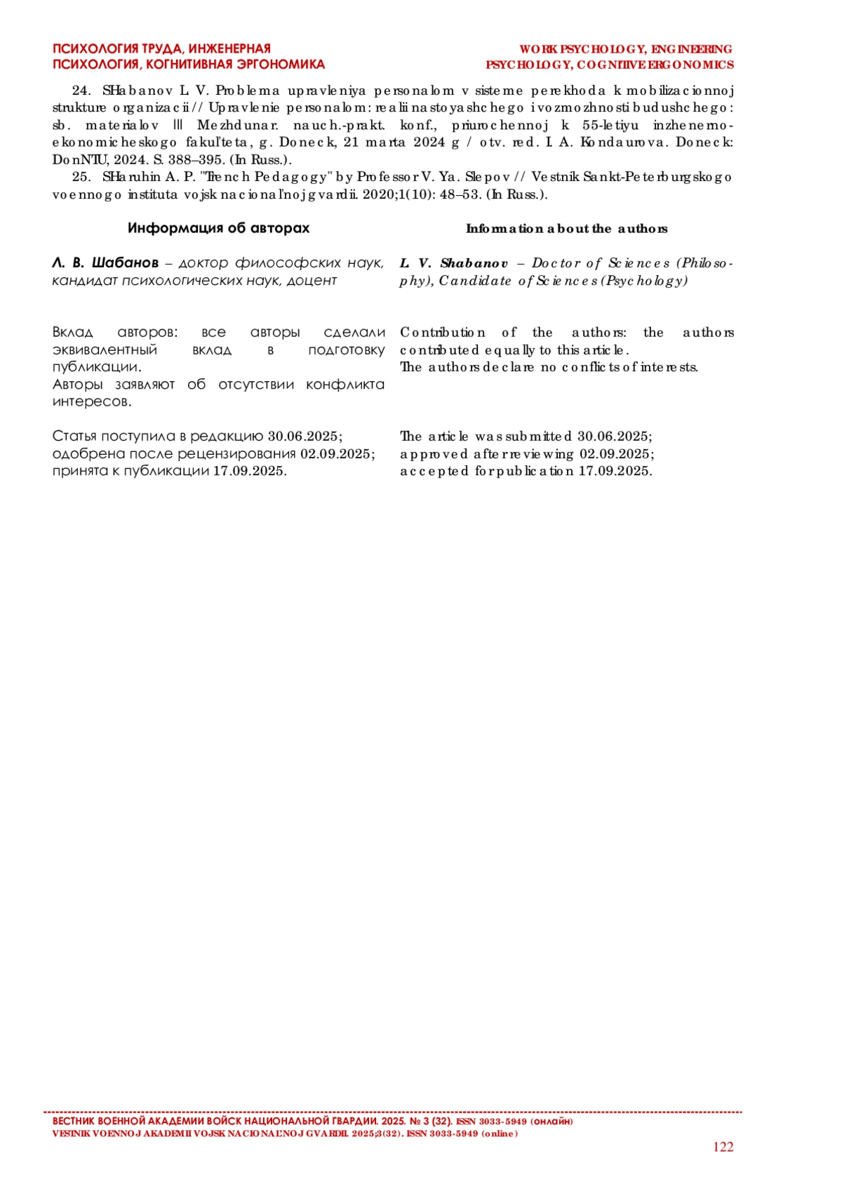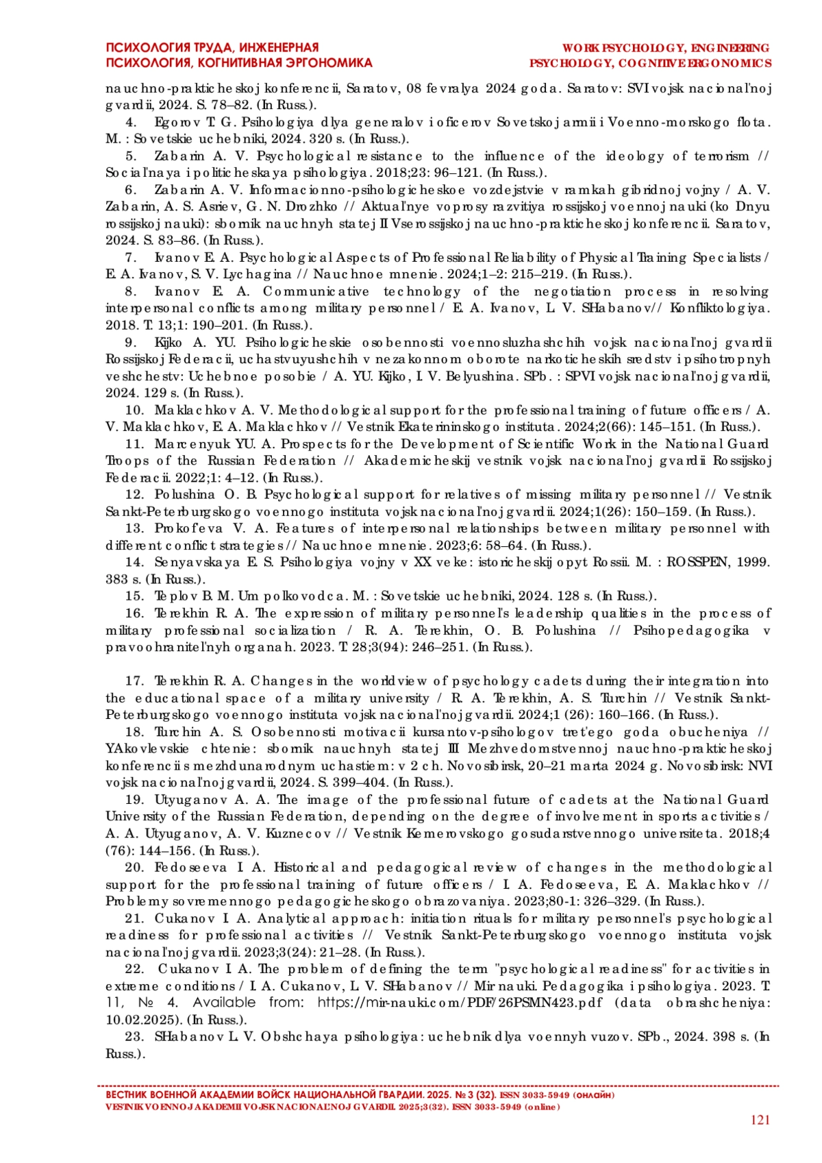 23. Шабанов Л. В. Общая психология: учебник для военных вузов. СПб., 2024. 398 с.