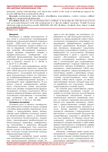 Инновации в сфере комплексного (в том числе и социального) сопровождения ветеранов специальной военной операции (далее – СВО) носят как локальный, так и глобальный характер, однако в любом случае их внедрение способствует повышению качества обслуживания военнослужащих, вызывает искренний интерес в профессиональном сообществе, спо-собствует формированию перспективных направлений для дальнейших исследований и научного поиска [1, С. 26–34; 2, С. 32–37; 3, С. 237–252].