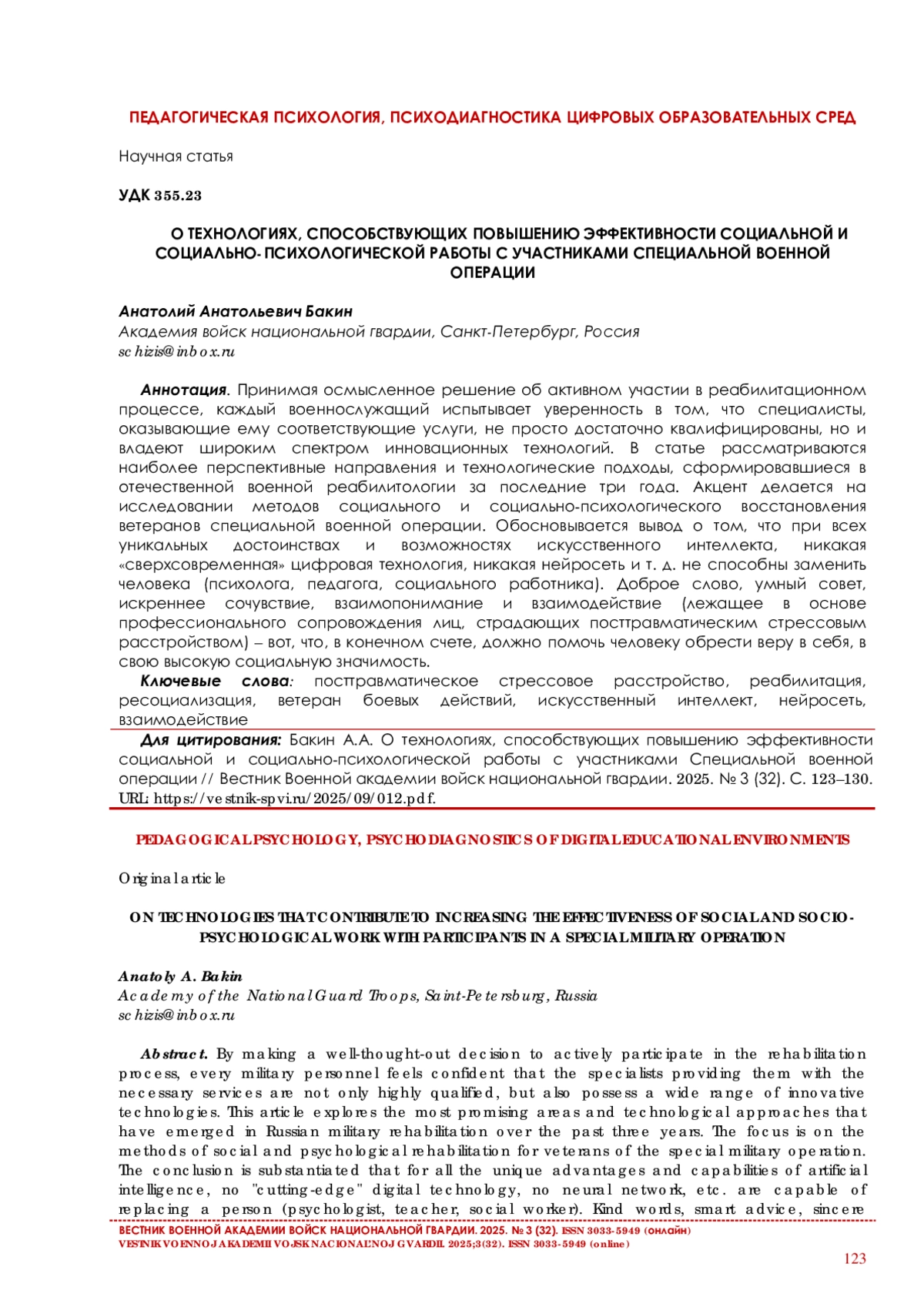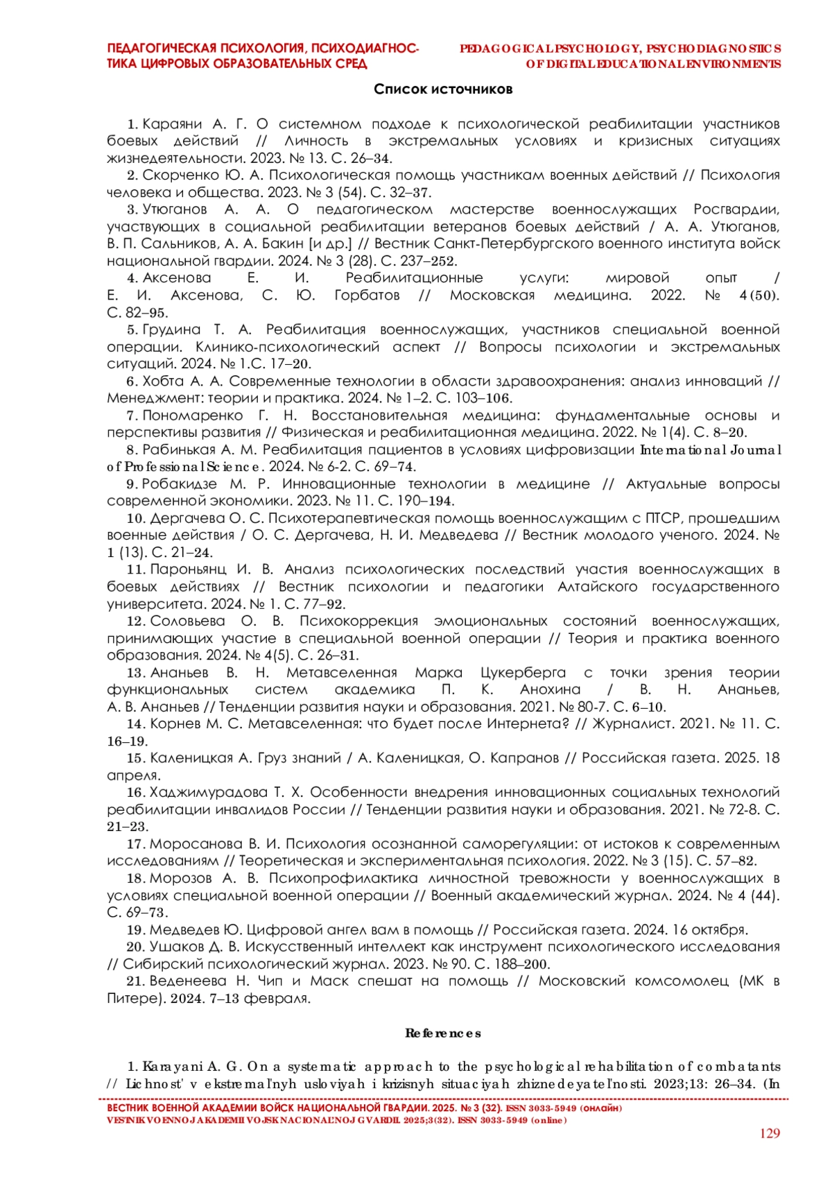 11. Пароньянц И. В. Анализ психологических последствий участия военнослужащих в боевых действиях // Вестник психологии и педагогики Алтайского государственного университета. 2024. № 1. С. 77-92.