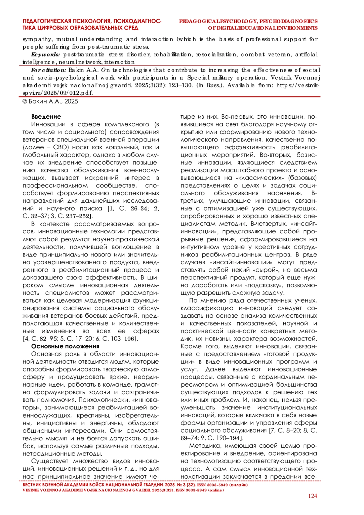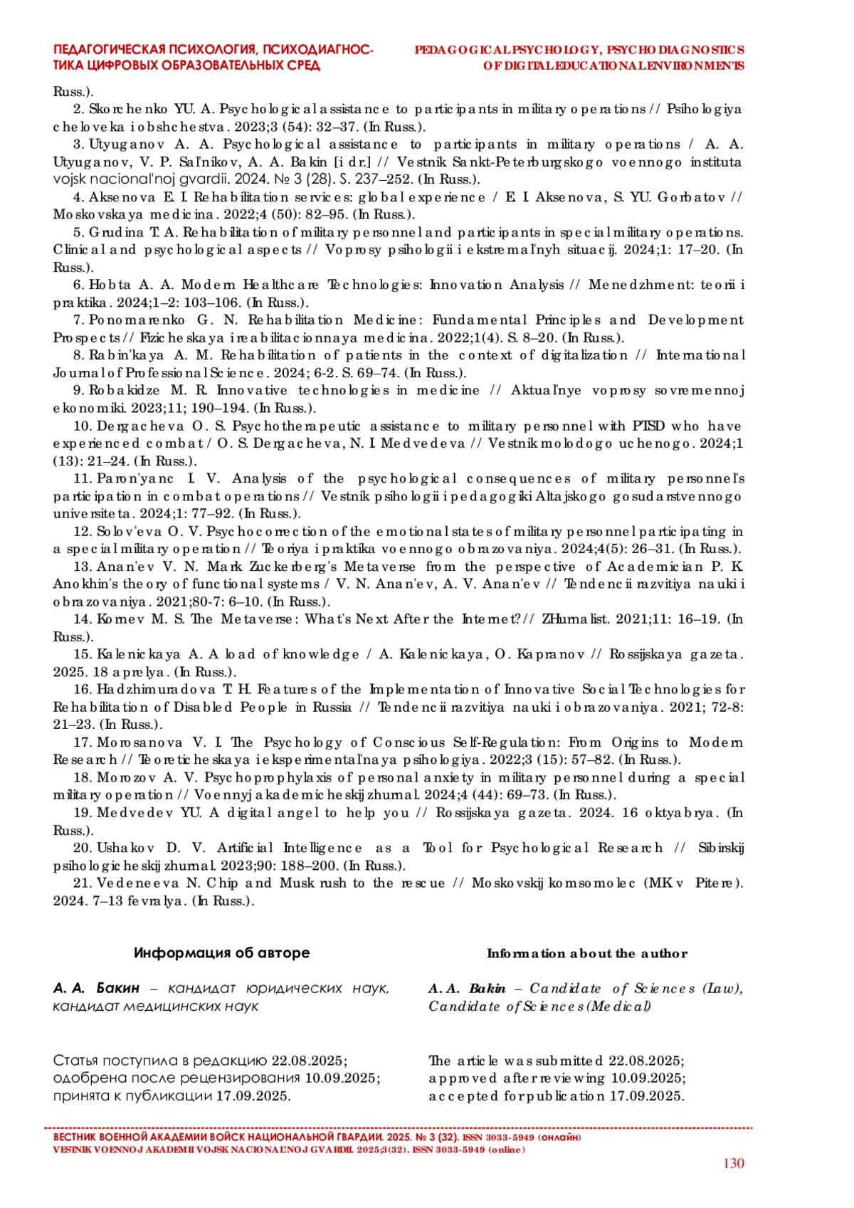 3. Утюганов А. А. О педагогическом мастерстве военнослужащих Росгвардии, участвующих в социальной реабилитации ветеранов боевых действий // Вестник Санкт-Петербургского военного института войск национальной гвардии. 2024. № 3 (28). С. 237-252.