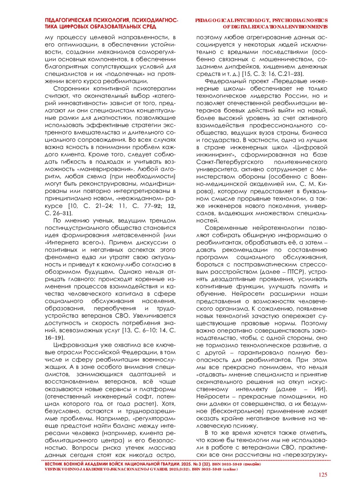 Принимая осмысленное решение об активном участии в реабилитационном процессе, каждый военнослужащий испытывает уверенность в том, что специалисты, оказывающие ему соответствующие услуги, не просто достаточно квалифицированы, но и владеют широким спектром инновационных технологий. В статье рассматриваются наиболее перспективные направления и технологические подходы, сформировавшиеся в отечественной военной реабилитологии за последние три года. Акцент делается на исследовании методов социального и социально-психологического восстановления ветеранов специальной военной операции. Обосновывается вывод о том, что при всех уникальных достоинствах и возможностях искусственного интеллекта, никакая «сверхсовременная» цифровая технология, никакая нейросеть и т. д. не способны заменить человека (психолога, педагога, социального работника). Доброе слово, умный совет, искреннее сочувствие, взаимопонимание и взаимодействие (лежащее в основе профессионального сопровождения лиц, страдающих посттравматическим стрессовым расстройством) – вот, что, в конечном счете, должно помочь человеку обрести веру в себя, в свою высокую социальную значимость.