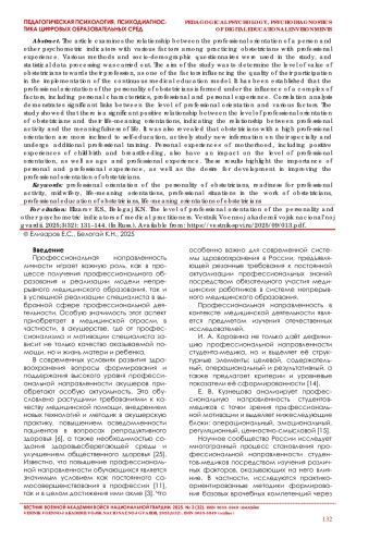 В статье исследуется взаимосвязь профессиональной направленности личности и других психометрических показателей с различными факторами у практикующих акушеров, имеющих профессиональный стаж. В исследовании применялись различные методики и социально-демографические анкетные данные, была проведена статистическая обработка данных. Целью исследования было определение уровня ценностного отношения акушеров к своей профессии, как одного из факторов, влияющих на качество их участия в реализации модели непрерывного медицинского образования. Установлено, что профессиональная направленность личности акушеров формируется под влиянием комплекса факторов, включая личностные характеристики, профессиональный и личный опыт. Корреляционный анализ демонстрирует значимые связи между уровнем профессиональной направленности и различными факторами. Исследование показало, что существует значимая положительная связь между уровнем профессиональной направленности акушеров и их смысложизненными ориентациями, указывающая на взаимосвязь между профессиональной активностью и осмысленностью жизни. Также выявлено, что акушеры с высокой профессиональной направленностью более склонны к самообразованию, активно изучают новую информацию по специальности и проходят дополнительное профессиональное обучение. Личный опыт материнства, включая позитивный опыт родов и грудного вскармливания, также оказывает влияние на уровень профессиональной направленности, равно как и возраст и профессиональный стаж. Эти результаты подчеркивают важность личного и профессионального опыта, а также стремления к развитию в повышении уровня профессиональной направленности акушеров.