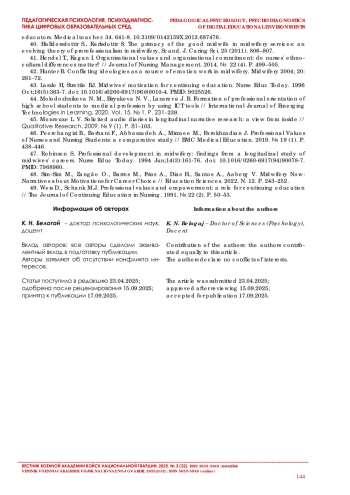 46. Poorchangizi B., Borhani F., Abbaszadeh A., Mirzaee M., Farokhzadian J. Professional Values of Nurses and Nursing Students: a comparative study // BMC Medical Education. 2019. № 19 (1). P. 438-446.
