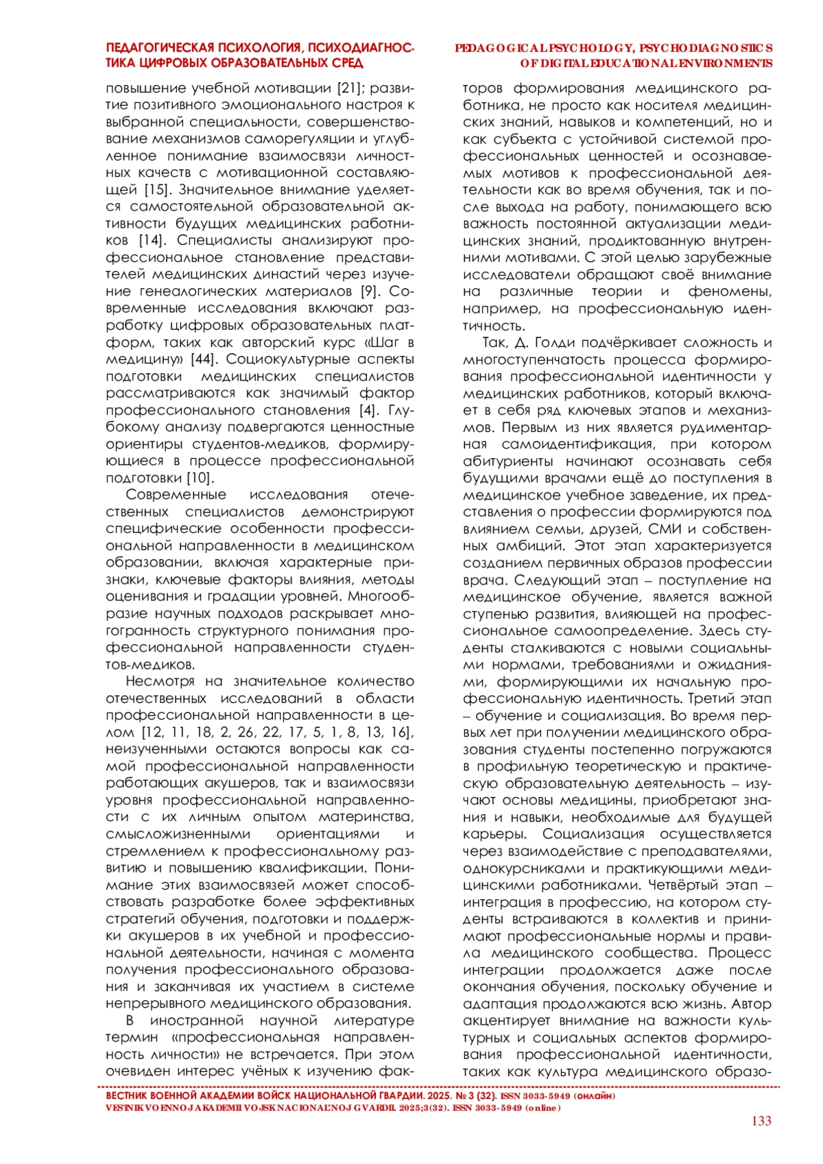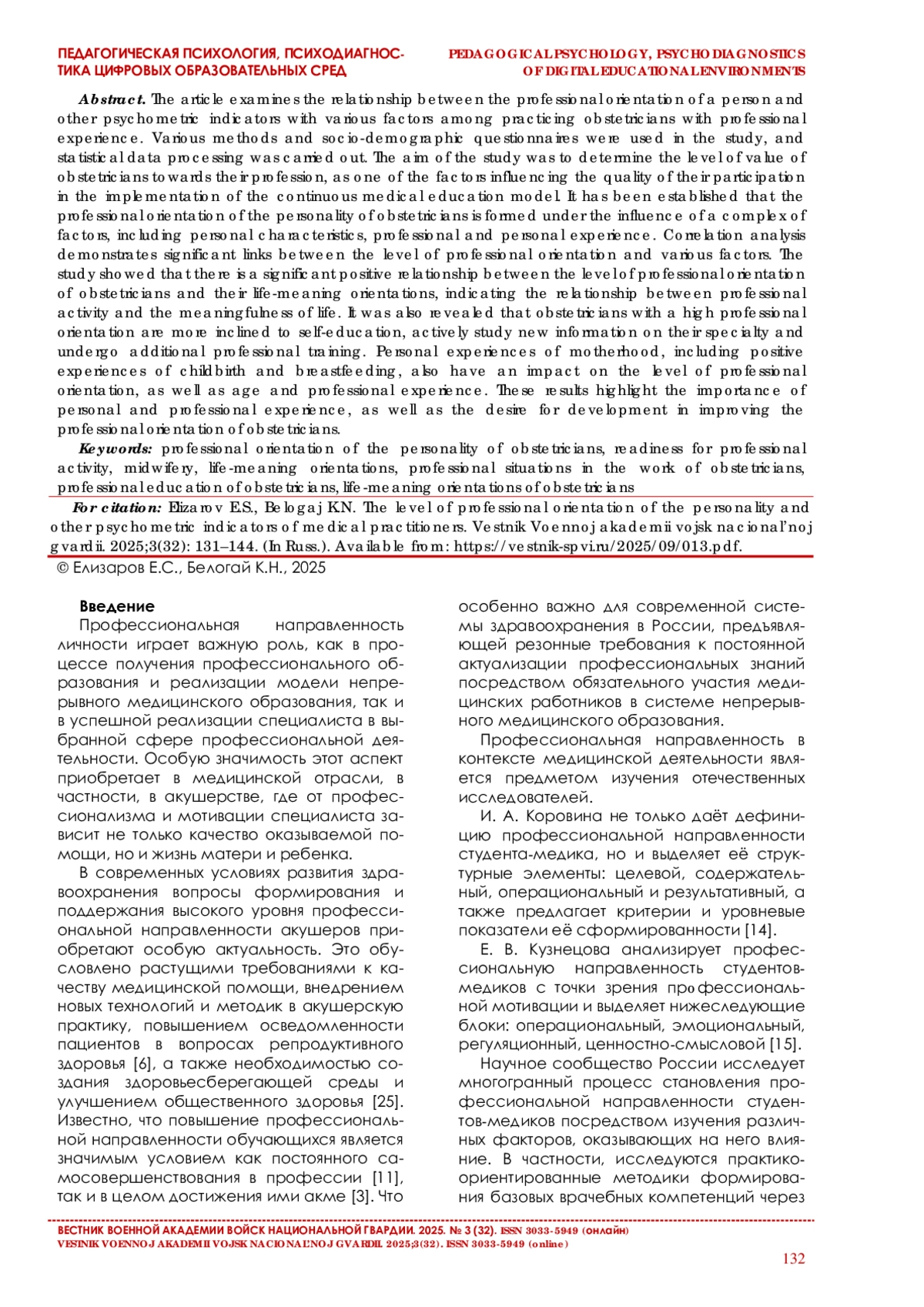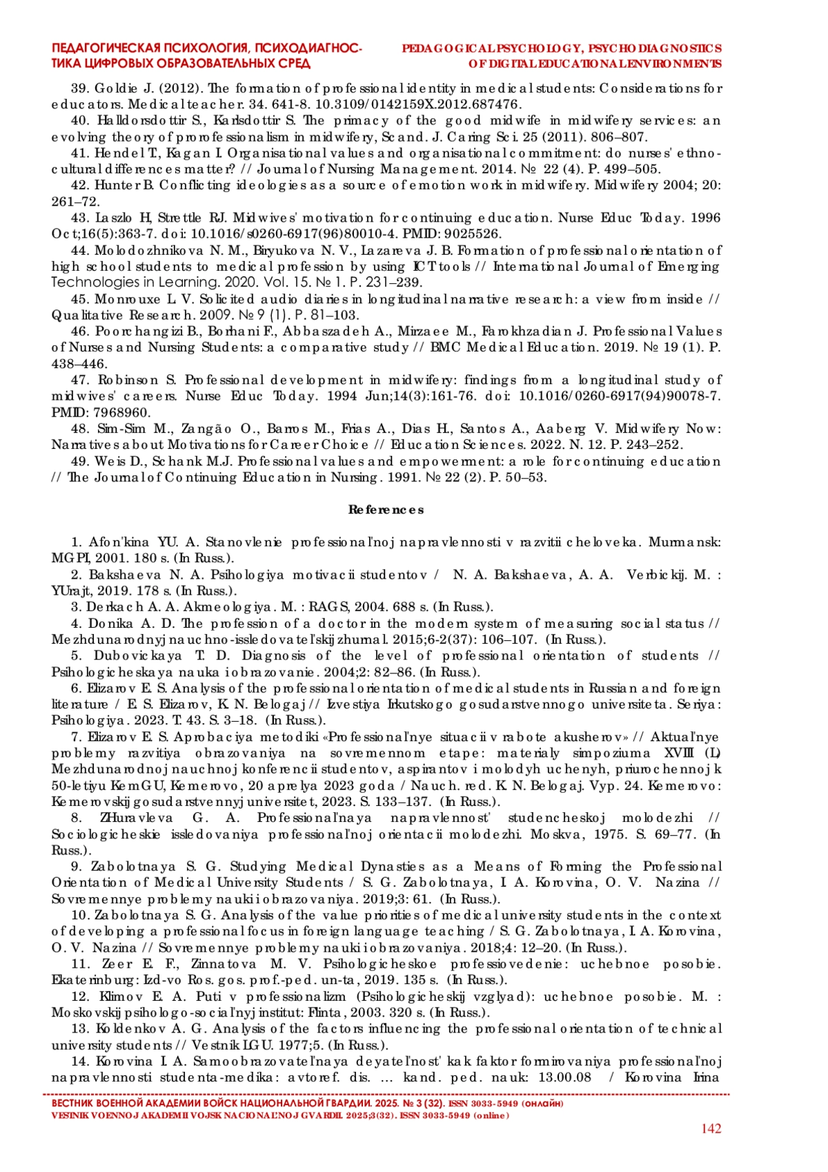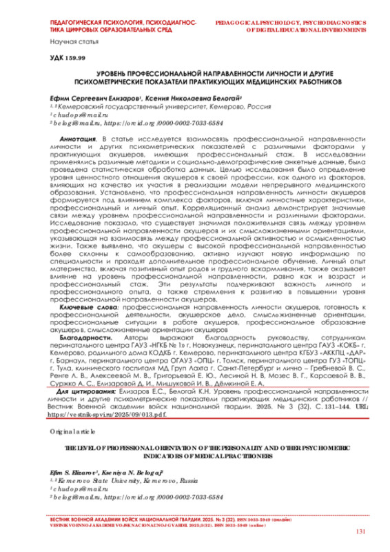 6. Елизаров Е. С. Анализ проблематики профессиональной направленности студентов медицинских специальностей в отечественной и зарубежной литературе// Известия Иркутского государственного университета.2023. Т. 43. С. 3-18.