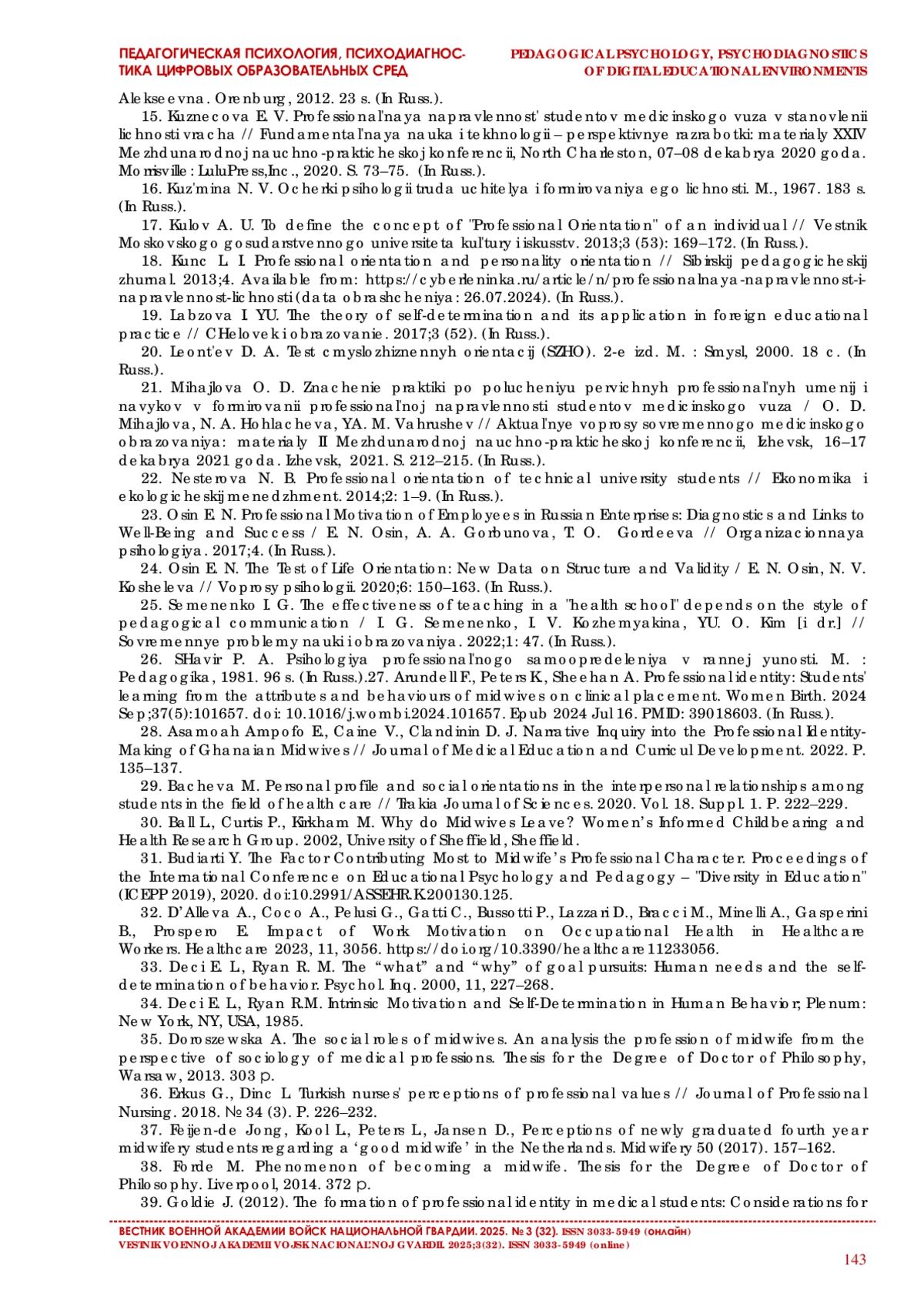 SHavir P. A. Psihologiya professional’nogo samoopredeleniya v rannej yunosti. M.: Pedagogika, 1981. 96 s. (In Russ.).27. Arundell F., Peters K., Sheehan A. Professional identity: Students’ learning from the attributes and behaviours of midwives on clinical placement. Women Birth. 2024 Sep;37(5):101657. Epub 2024 Jul 16. PMID: 39018603. (In Russ.). DOI: 10.1016/j.wombi.2024.101657 EDN: WDOXNL PMID: 39018603