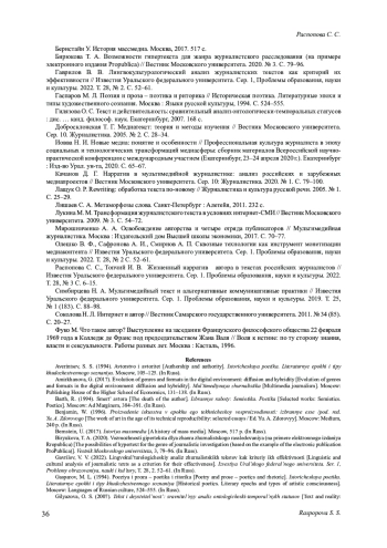 7. Гаврилов В. В. Лингвокультурологический анализ журналистских текстов как критерий их эффективности // Известия Уральского федерального университета. Сер. 1, Проблемы образования, науки и культуры. 2022. Т. 28, № 2. С. 52-61. EDN: XFGPMP