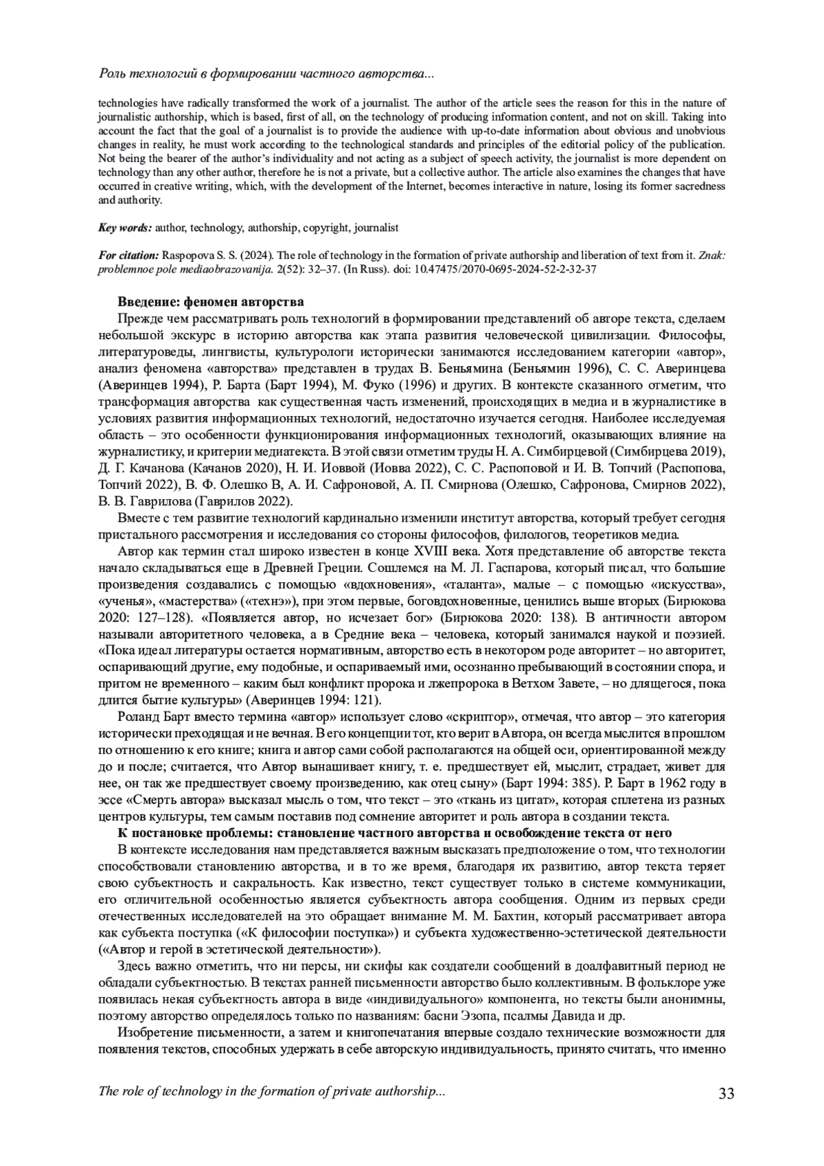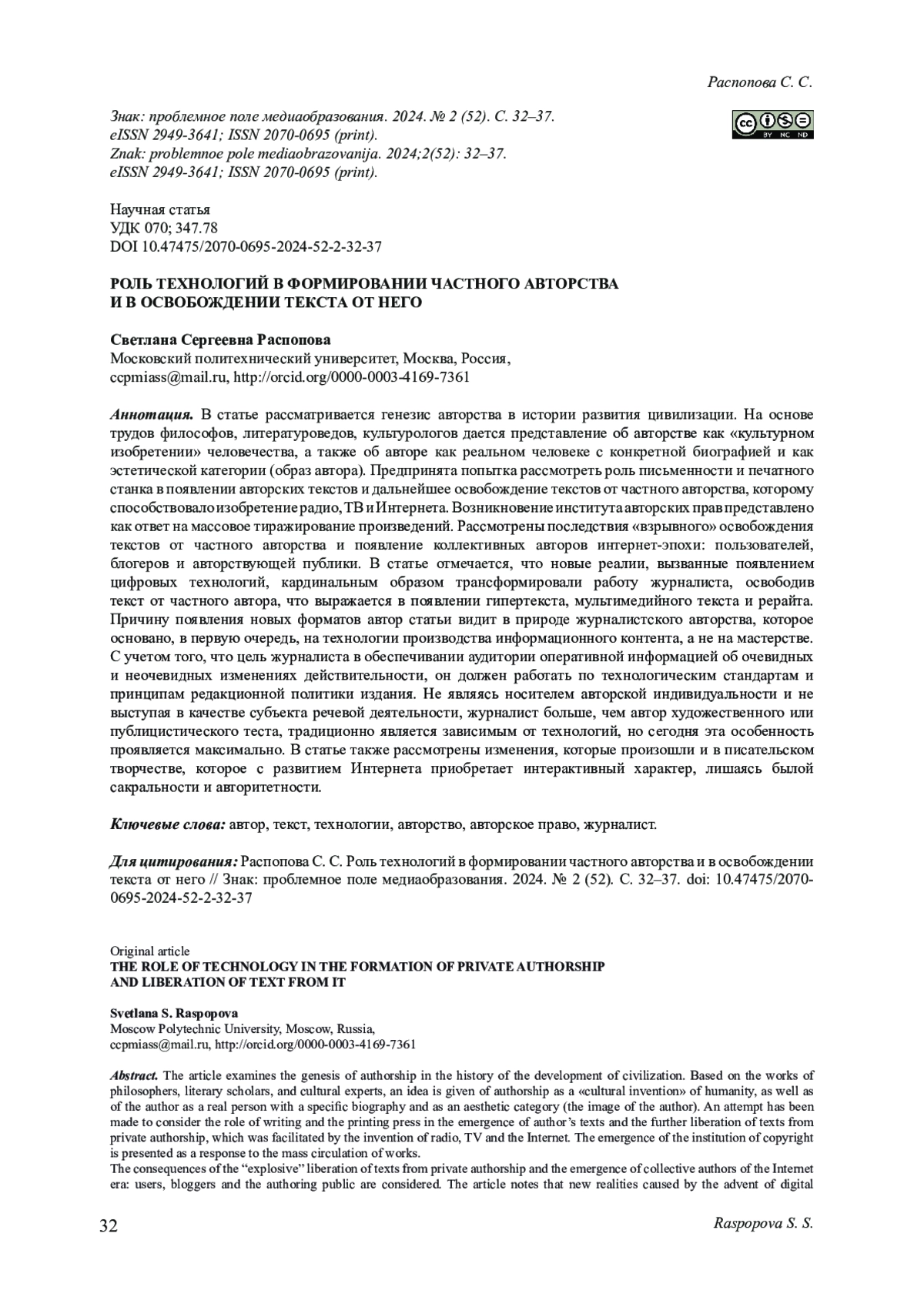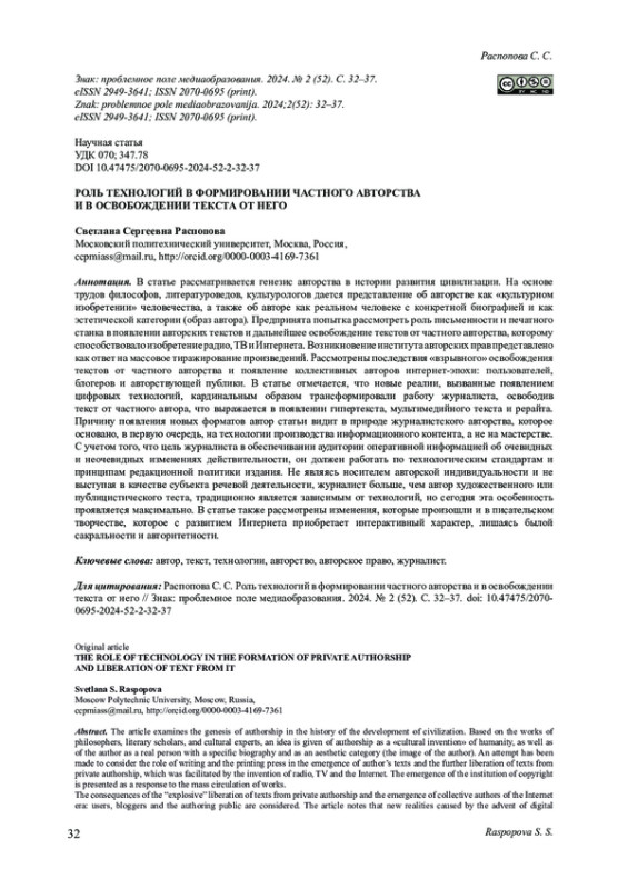 В статье рассматривается генезис авторства в истории развития цивилизации. На основе трудов философов, литературоведов, культурологов дается представление об авторстве как «культурном изобретении» человечества, а также об авторе как реальном человеке с конкретной биографией и как эстетической категории (образ автора). Предпринята попытка рассмотреть роль письменности и печатного станка в появлении авторских текстов и дальнейшее освобождение текстов от частного авторства, которому способствовало изобретение радио, ТВ и Интернета. Возникновение института авторских прав представлено как ответ на массовое тиражирование произведений. Рассмотрены последствия «взрывного» освобождения текстов от частного авторства и появление коллективных авторов интернет-эпохи: пользователей, блогеров и авторствующей публики. В статье отмечается, что новые реалии, вызванные появлением цифровых технологий, кардинальным образом трансформировали работу журналиста, освободив текст от частного автора, что выражается в появлении гипертекста, мультимедийного текста и рерайта. Причину появления новых форматов автор статьи видит в природе журналистского авторства, которое основано, в первую очередь, на технологии производства информационного контента, а не на мастерстве. С учетом того, что цель журналиста в обеспечивании аудитории оперативной информацией об очевидных и неочевидных изменениях действительности, он должен работать по технологическим стандартам и принципам редакционной политики издания. Не являясь носителем авторской индивидуальности и не выступая в качестве субъекта речевой деятельности, журналист больше, чем автор художественного или публицистического теста, традиционно является зависимым от технологий, но сегодня эта особенность проявляется максимально. В статье также рассмотрены изменения, которые произошли и в писательском творчестве, которое с развитием Интернета приобретает интерактивный характер, лишаясь былой сакральности и авторитетности.