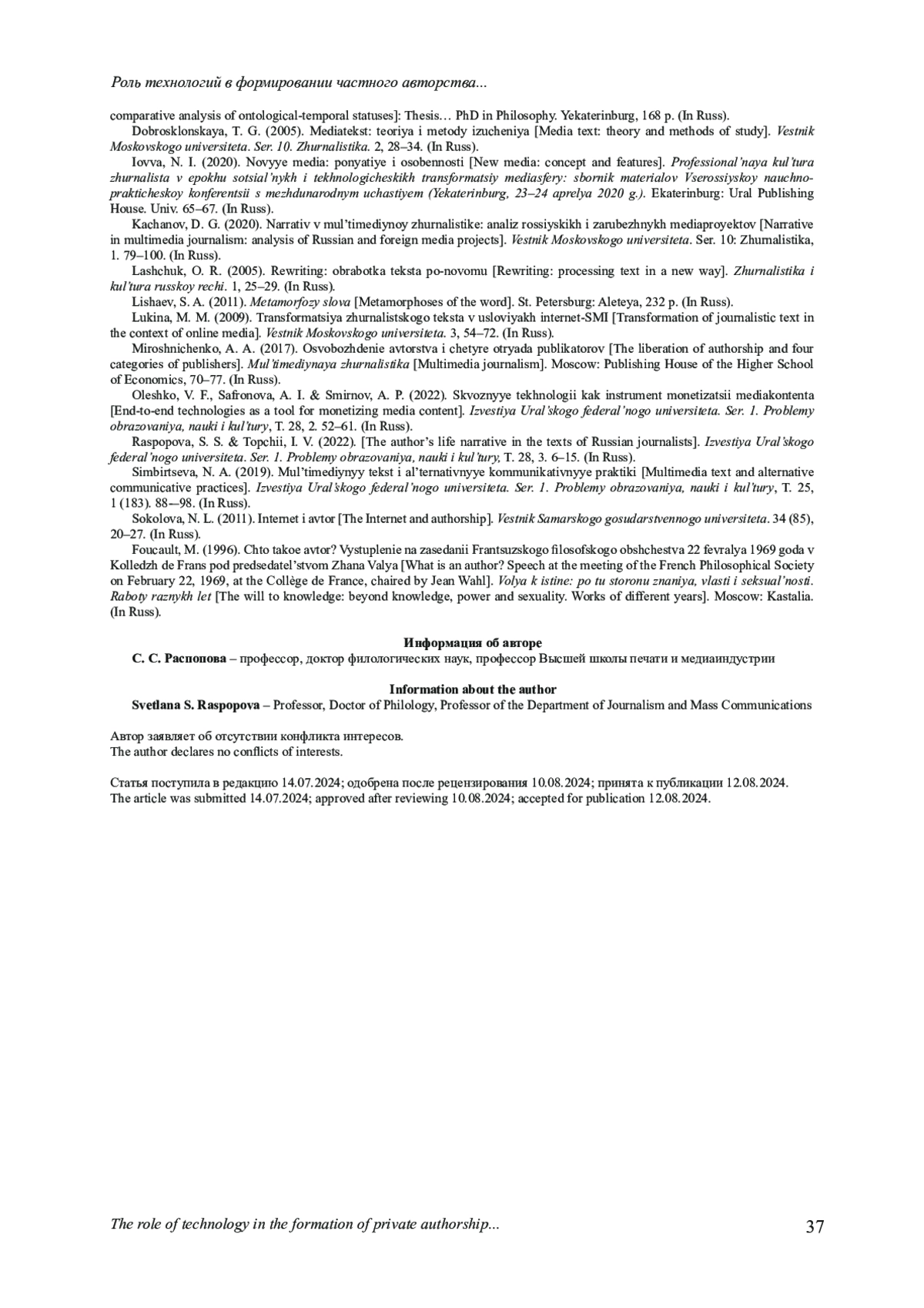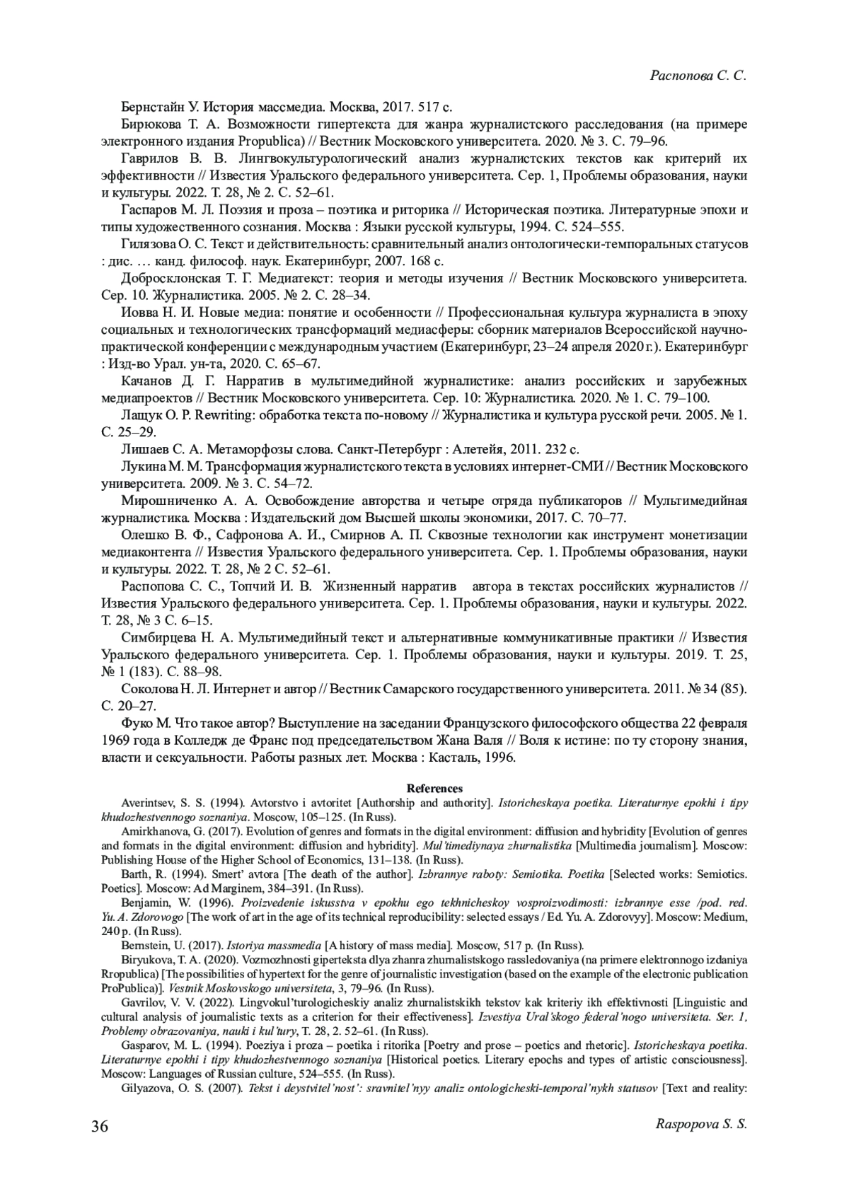 18. Распопова С. С., Топчий И. В. Жизненный нарратив автора в текстах российских журналистов // Известия Уральского федерального университета. Сер. 1. Проблемы образования, науки и культуры. 2022. Т. 28, № 3 С. 6-15.
