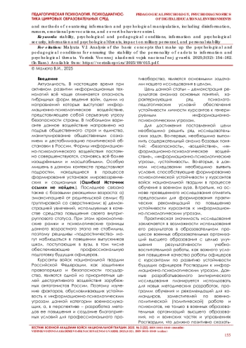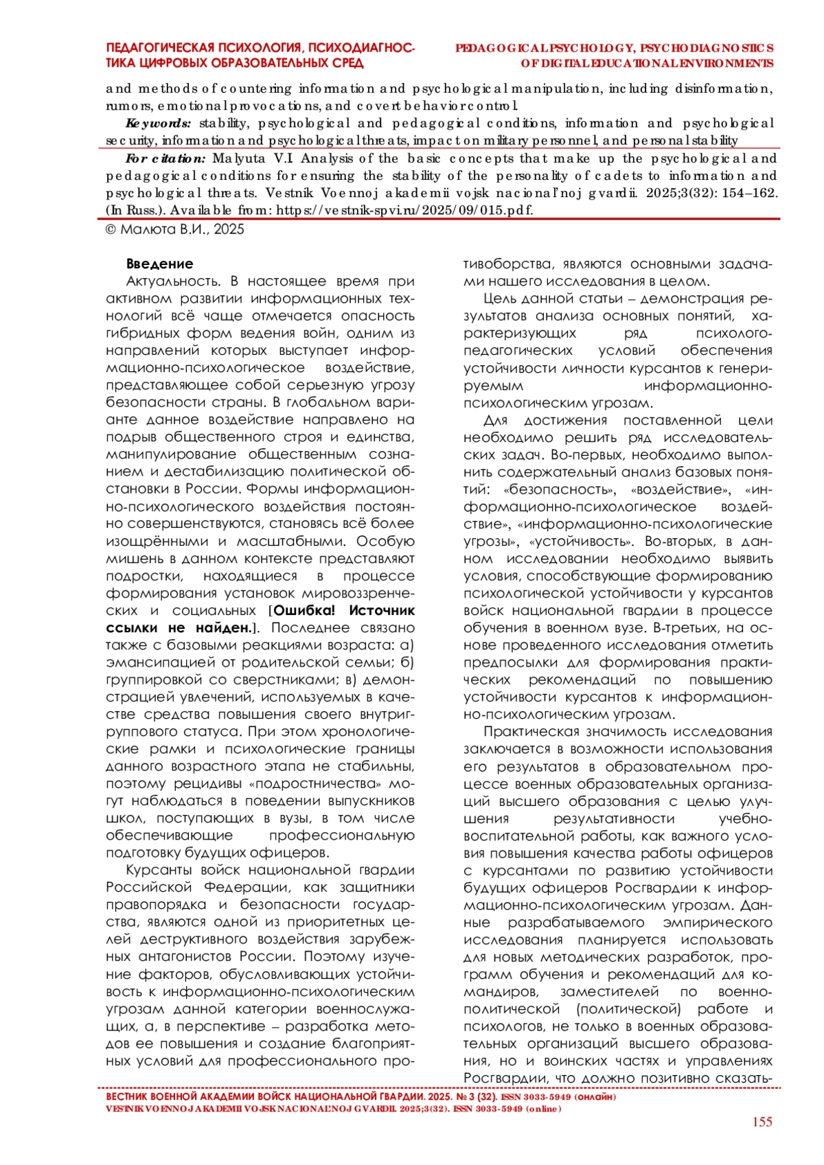 В статье проведен первичный анализ основных понятий, применяемых для описания психолого-педагогических условий обеспечения устойчивости личности курсантов к информационно-психологическим угрозам. Рассматриваются ключевые понятия: безопасность, информационно-психологическое воздействие, устойчивость, а также теории И. П. Павлова, К. Лоренца, А. Маслоу и других ученых, в работах которых приводятся описания способов информационного воздействия и их последствия для поведения человека в типовых и экстремальных ситуациях. В условиях непрерывного развития информационных технологий и гибридных форм ведения войн, обеспечение устойчивости к информационно-психологическим угрозам становится актуальной задачей для российского общества. Наиболее уязвимыми к информационно-психологическим угрозам традиционно считаются подростки. Но и курсанты войск национальной гвардии Российской Федерации в последнее время являются основной мишенью для деструктивного информационного воздействия. Целью исследования выступает теоретический анализ условий, средств и методов противодействия информационно-психологической манипуляции, включающей дезинформацию, слухи, эмоциональные провокации и скрытое управление поведением.