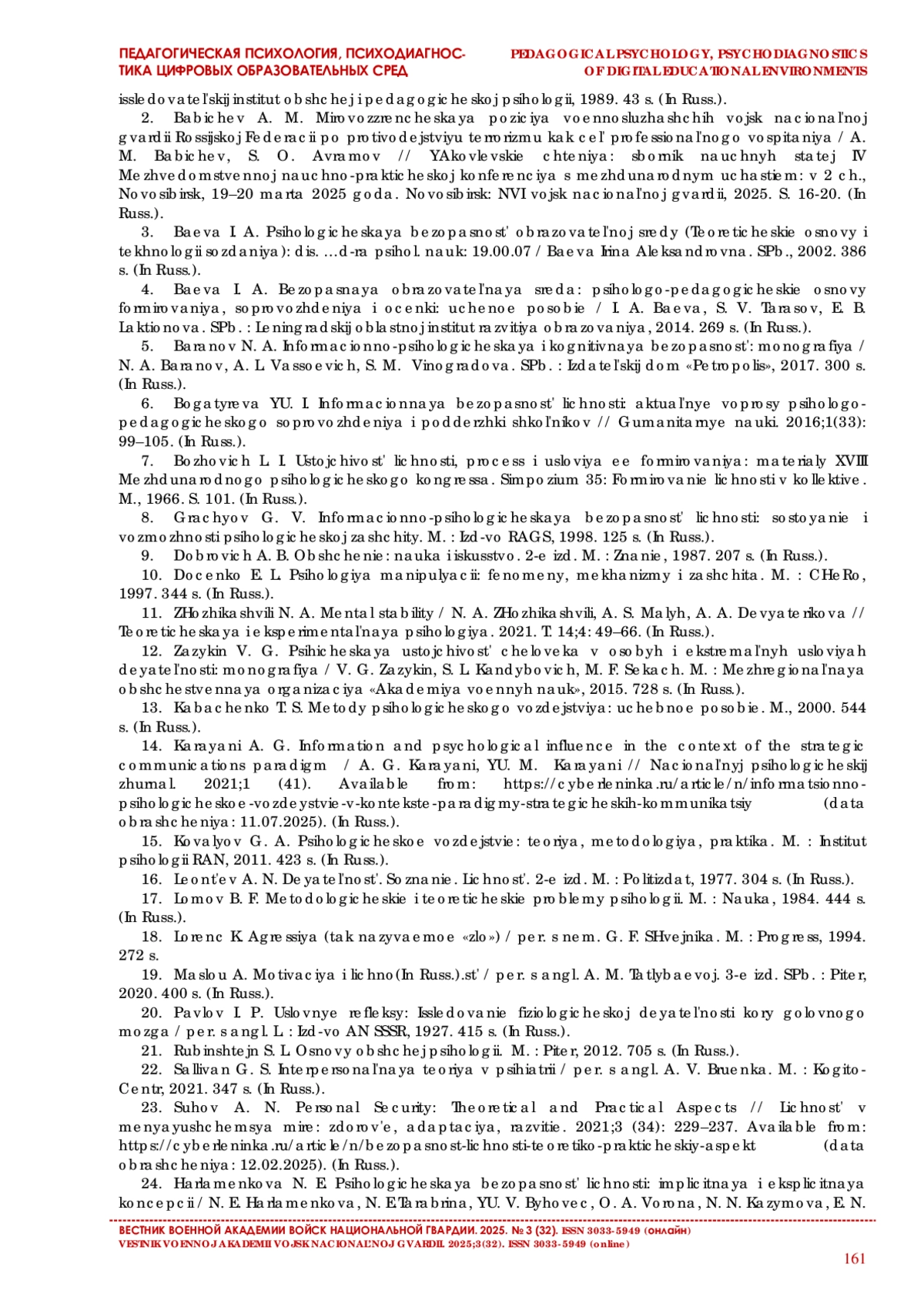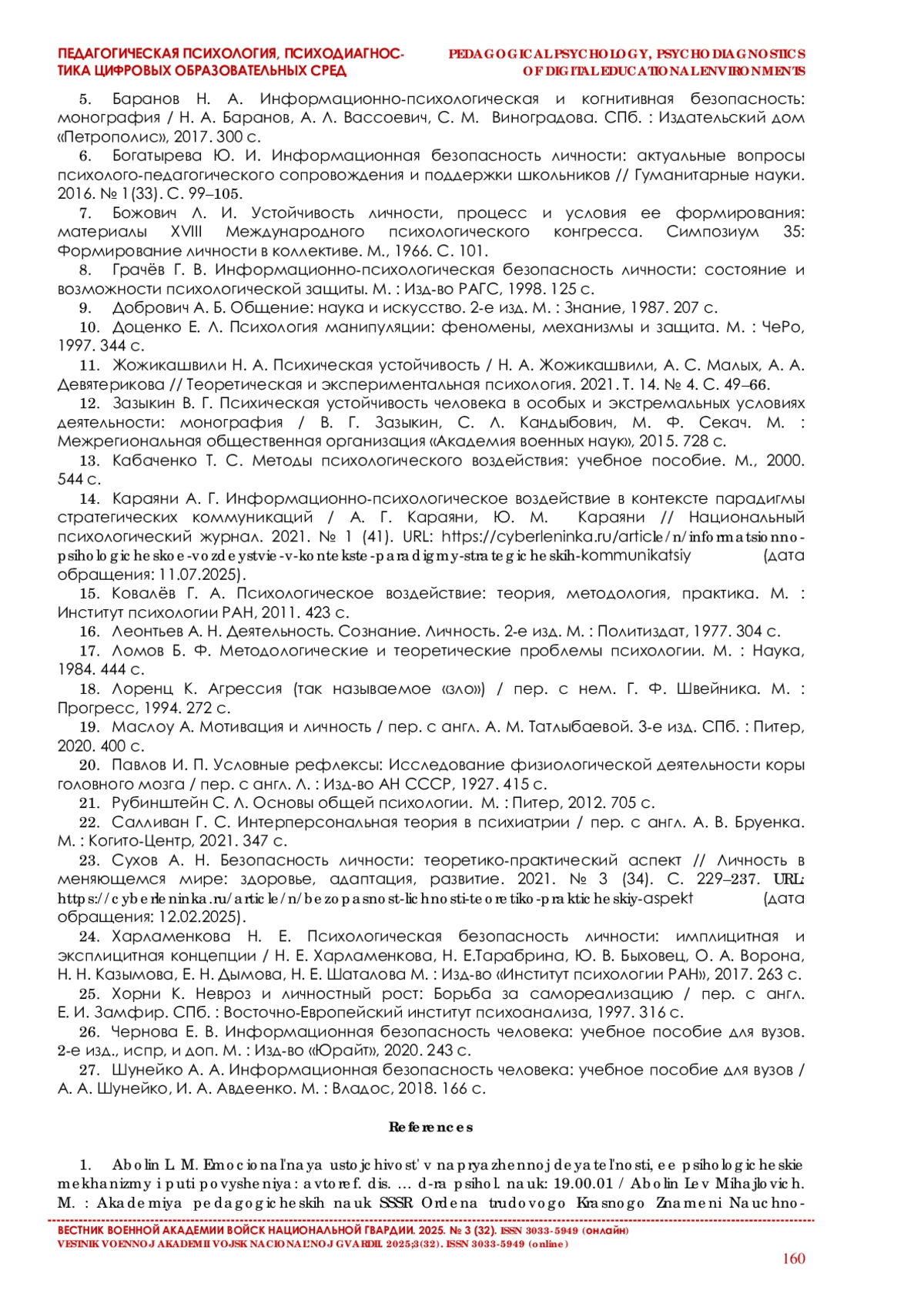 Baeva I. A. Psihologicheskaya bezopasnost’ obrazovatel’noj sredy (Teoreticheskie osnovy i tekhnologii sozdaniya): dis. …d-ra psihol. nauk: 19.00.07 / Baeva Irina Aleksandrovna. SPb., 2002. 386 s. (In Russ.).