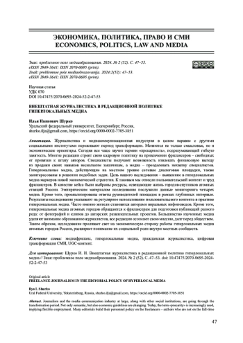 10. Мухина О. С. Экономические аспекты медиафриланса цифровой эпохи // Вестник Московского университета. Серия 10. Журналистика. 2023. № 5. С. 40-60. EDN: JVTRTS