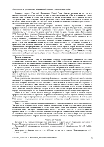 3. Капустина А. А. Фриланс журналистика в XXI веке: условия труда и оценки // Век информации. 2019. Т. 7, № 1. С. 119-125. EDN: VYALQC