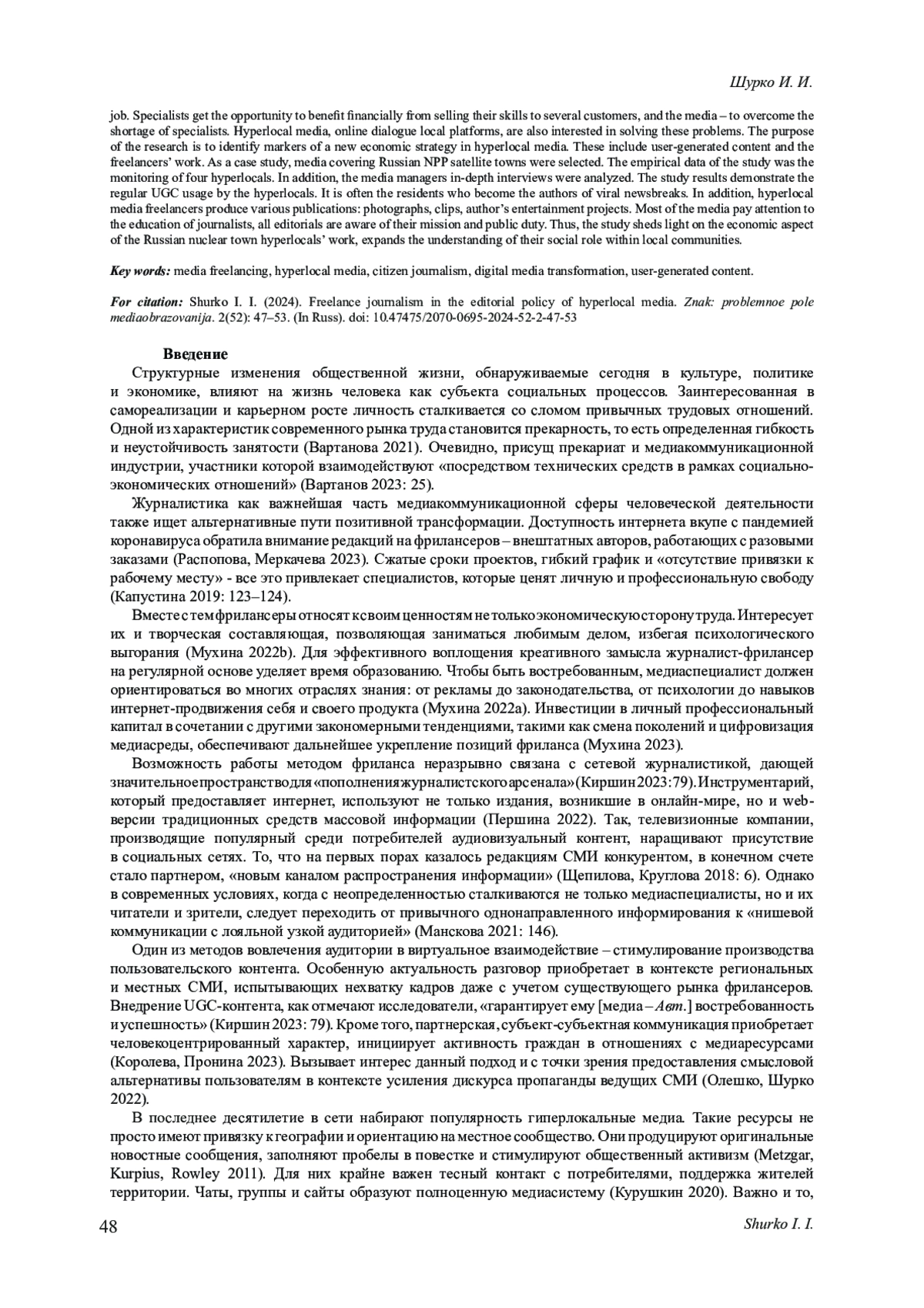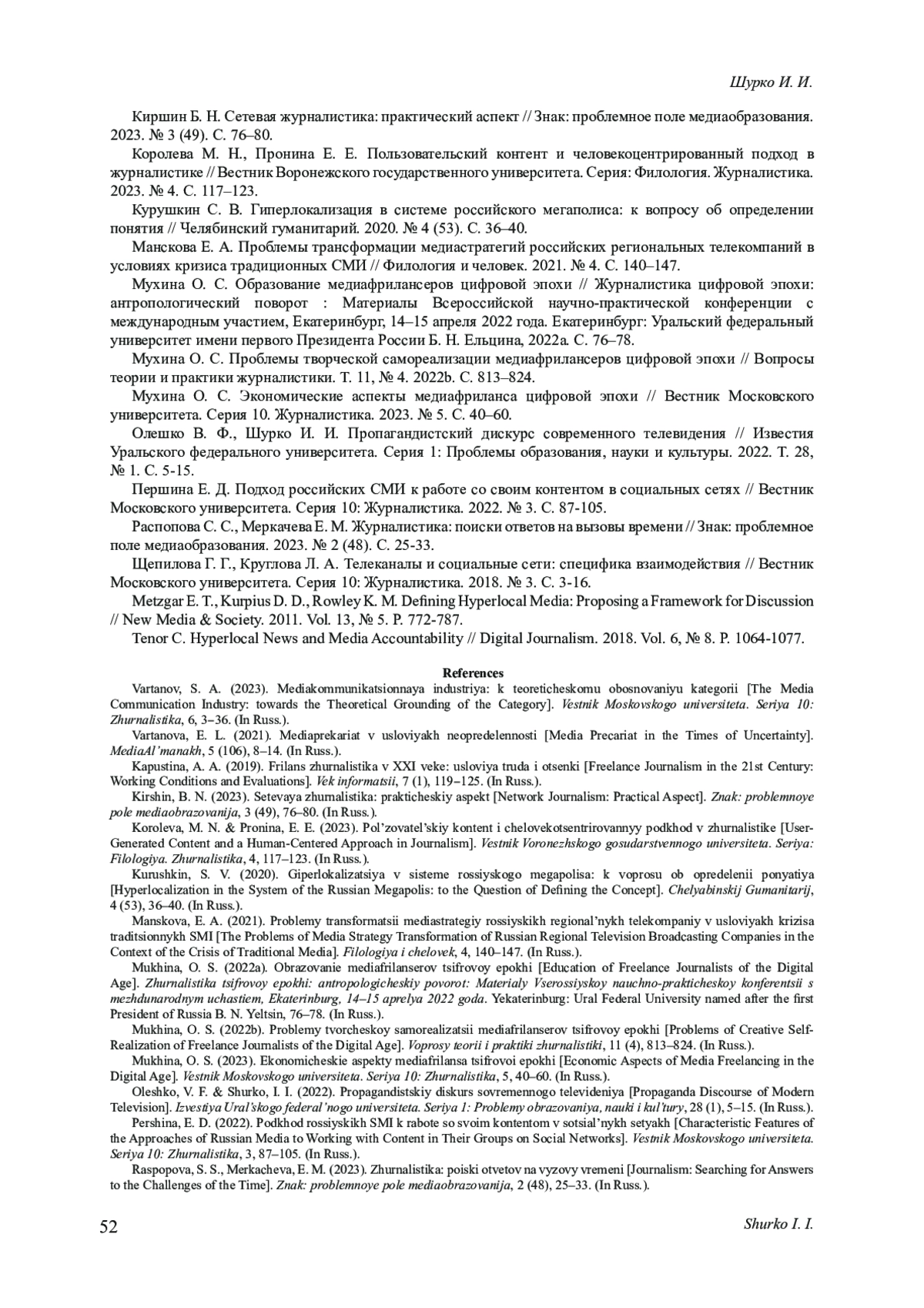 9. Мухина О. С. Проблемы творческой самореализации медиафрилансеров цифровой эпохи // Вопросы теории и практики журналистики. T. 11, № 4. 2022b. С. 813-824. EDN: DNKLYY