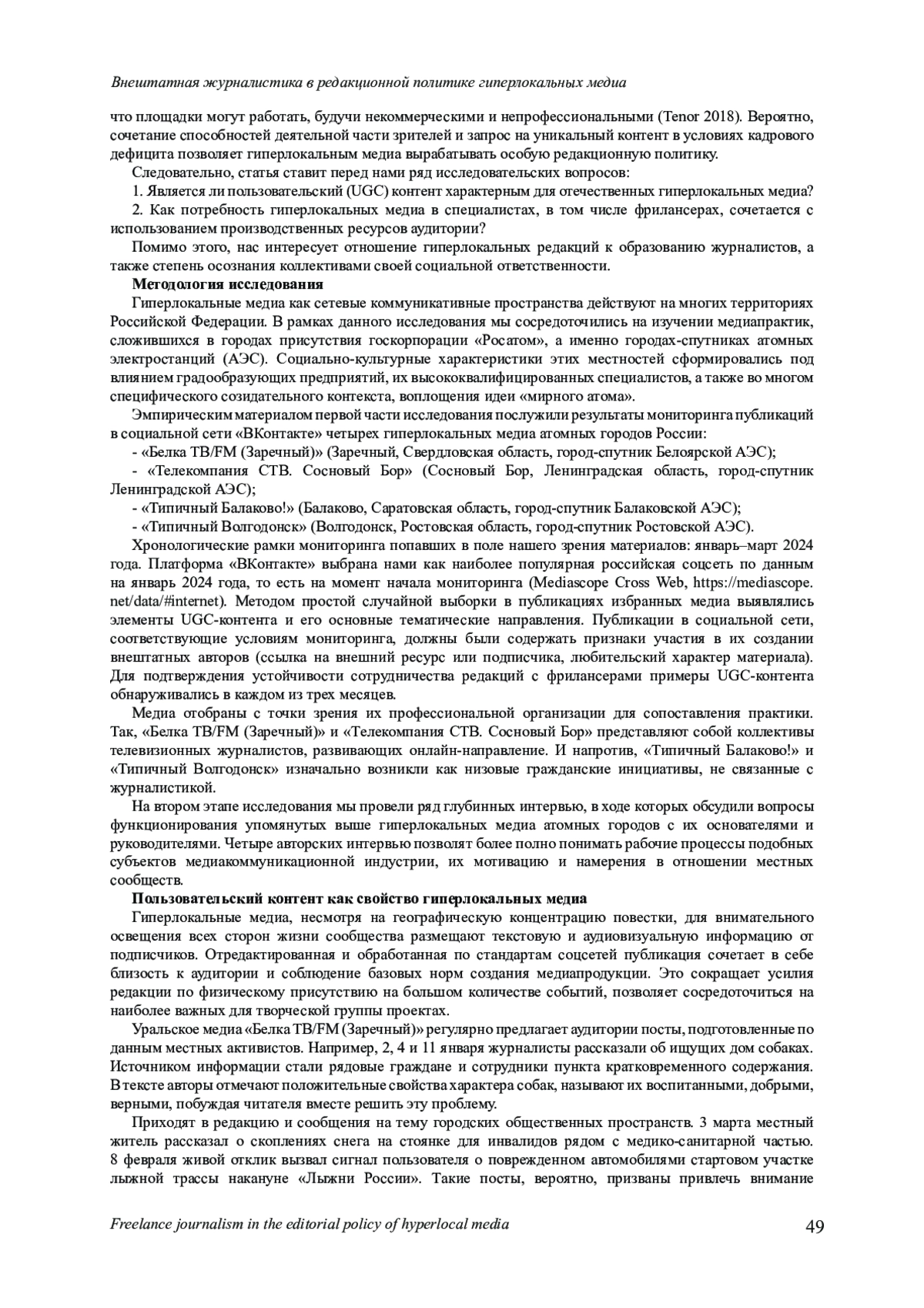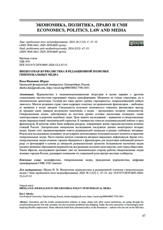 Журналистика и медиакоммуникационная индустрия в целом наравне с другими социальными институтами переживают период трансформации. Меняются не только смысловые, но и экономические ориентиры. Сегодня все чаще звучит термин «прекарность», подразумевающий гибкую занятость. Многие редакции строят свою кадровую политику на привлечении фрилансеров - свободных от привязки к штату авторов. Специалисты получают возможность извлекать финансовую выгоду из продажи своих навыков нескольким заказчикам, а медиа - преодолевать нехватку специалистов. Гиперлокальные медиа, действующие на местном уровне сетевые диалоговые площадки, также заинтересованы в решении подобных задач. Цель нашего исследования - выявление в гиперлокальных медиа маркеров новой экономической стратегии. К таковым мы отнесли пользовательский контент и труд фрилансеров. В качестве кейса были выбраны ресурсы, освещающие жизнь городов-спутников атомных станций России. Эмпирическим материалом исследования послужили данные мониторинга четырех медиа. Кроме того, проанализированы ответы руководителей площадок в рамках глубинных интервью. Результаты исследования указывают на регулярное использование пользовательского контента в практике гиперлокальных медиа. Часто именно жители становятся авторами виральных инфоповодов. Кроме того, гиперлокальные медиа атомных городов обращаются к фрилансерам для подготовки публикаций разного рода: от фотографий и клипов до авторских развлекательных проектов. Большинство изученных медиа уделяют внимание образованию журналистов, все редакции осознают свою миссию, долг перед обществом. Таким образом, исследование проливает свет на экономическую сторону работы гиперлокальных медиа атомных городов России, расширяет понимание их социальной роли внутри местных сообществ.