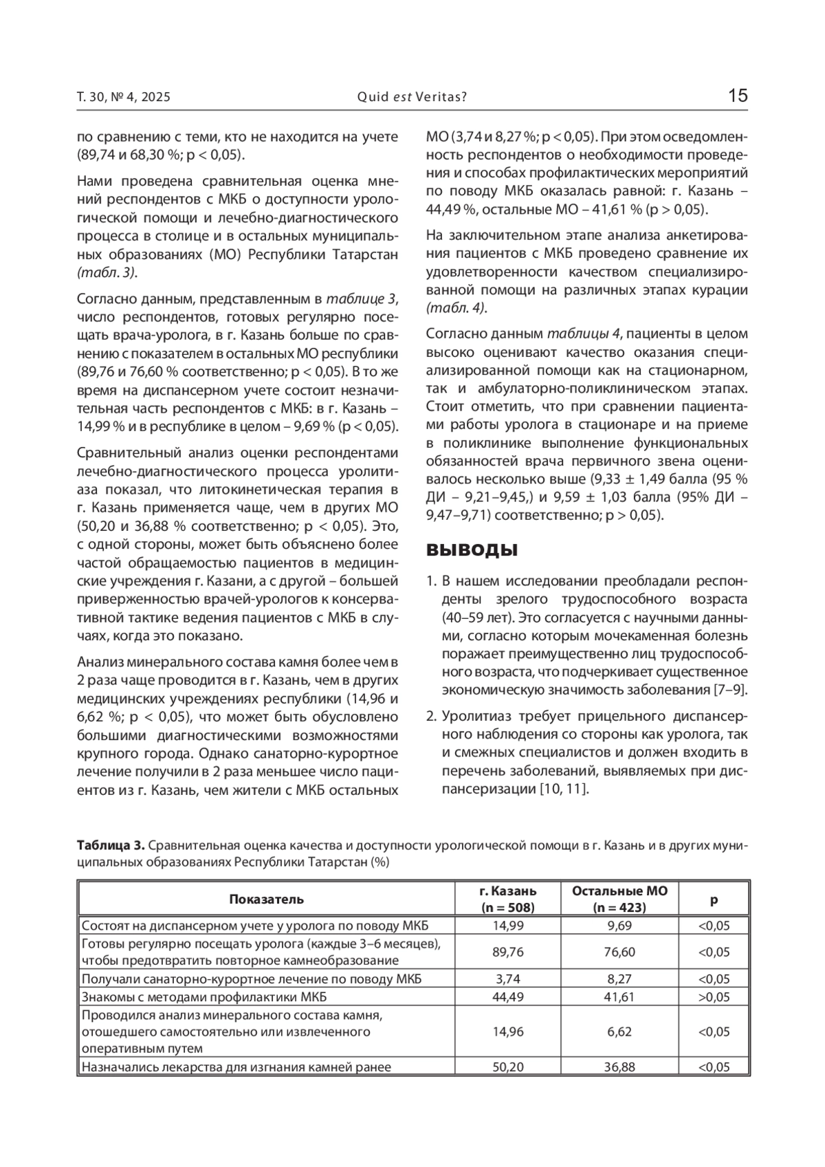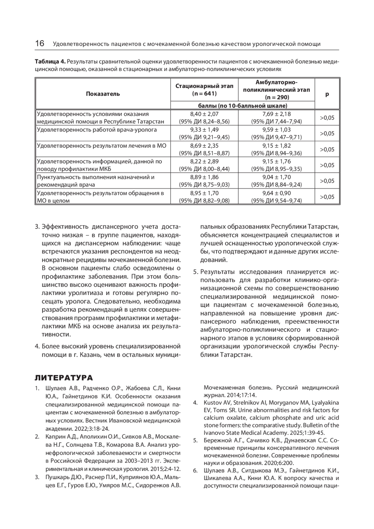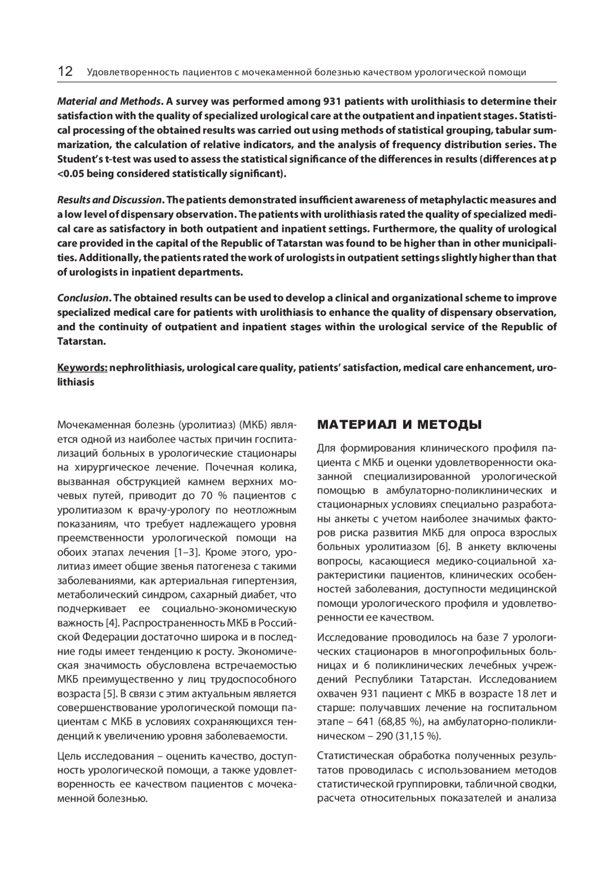 Результаты и обсуждение. Выявлена недостаточная осведомленность пациентов о метафилактических мероприятиях и низкий уровень диспансерного наблюдения. Пациенты с уролитиазом оценили как удовлетворительное качество специализированной медицинской помощи как в амбулаторно-поликлинических, так и в стационарных условиях. При этом качество урологической помощи, оказываемой в столице Республики Татарстан, оказалось выше, чем в остальных муниципальных образованиях. Кроме этого, пациенты оценили работу врача-уролога в амбулаторно-поликлинических условиях несколько выше, чем врачей урологического стационара.