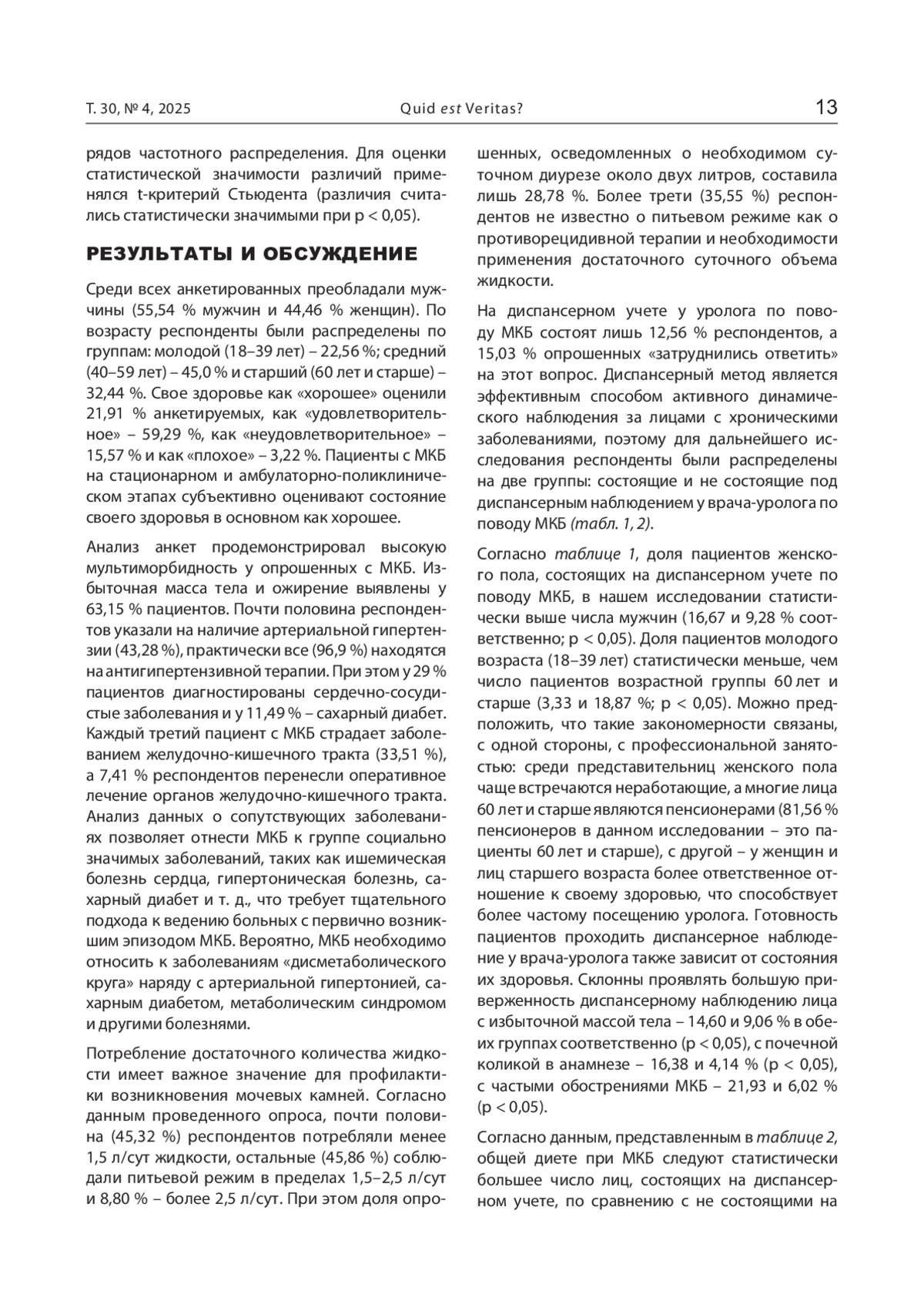 Материал и методы. Проведено анкетирование 931 пациентов с целью определения удовлетворенности респондентов с уролитиазом качеством специализированной урологической помощи на амбулаторно-поликлиническом и стационарном этапах. Статистическая обработка полученных результатов проводилась с использованием методов статистической группировки, табличной сводки, расчета относительных показателей и анализа рядов частотного распределения. Для оценки статистической значимости различий результатов применялся t-критерий Стьюдента (различия считались статистически значимыми при р < 0,05).