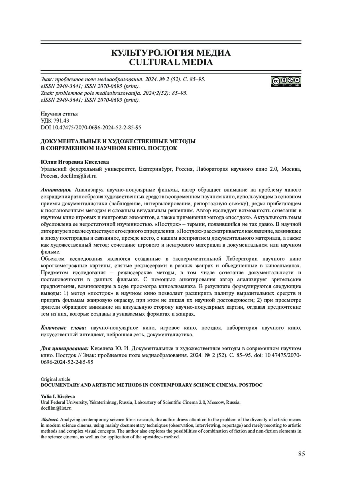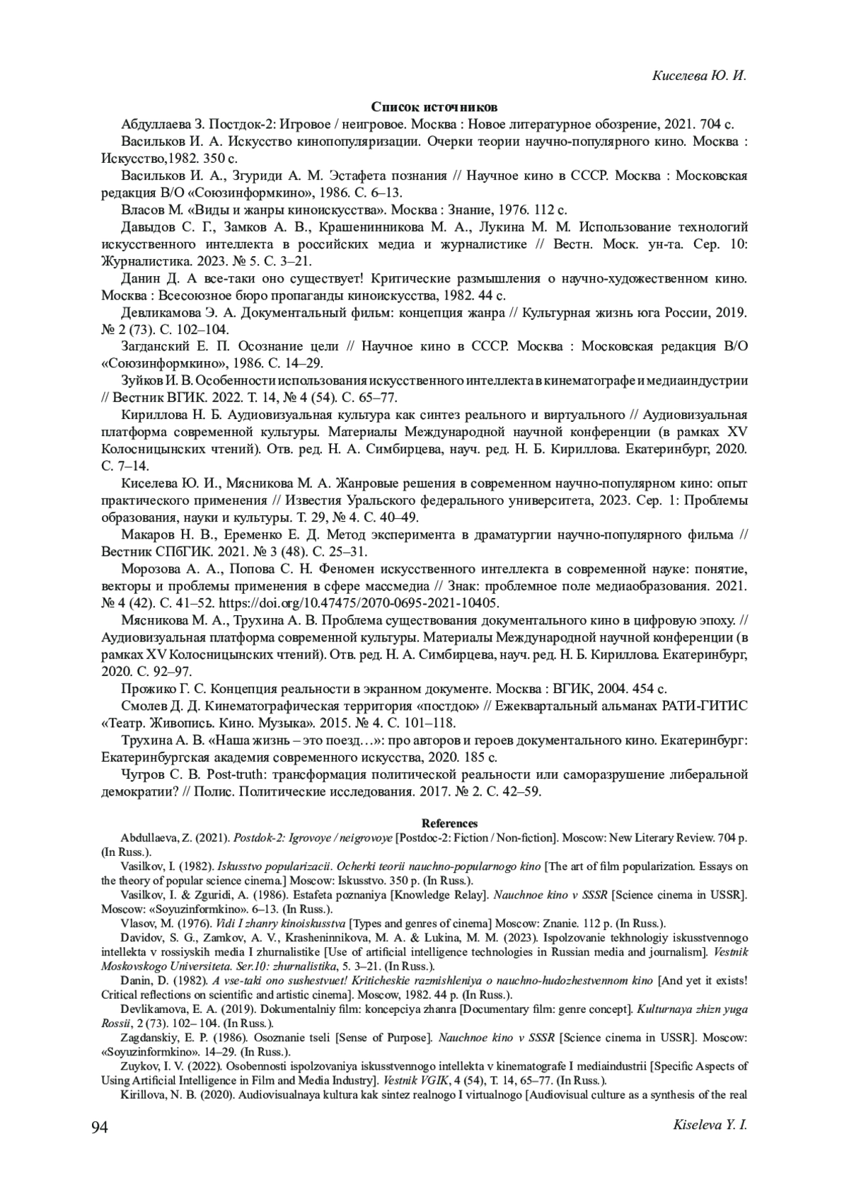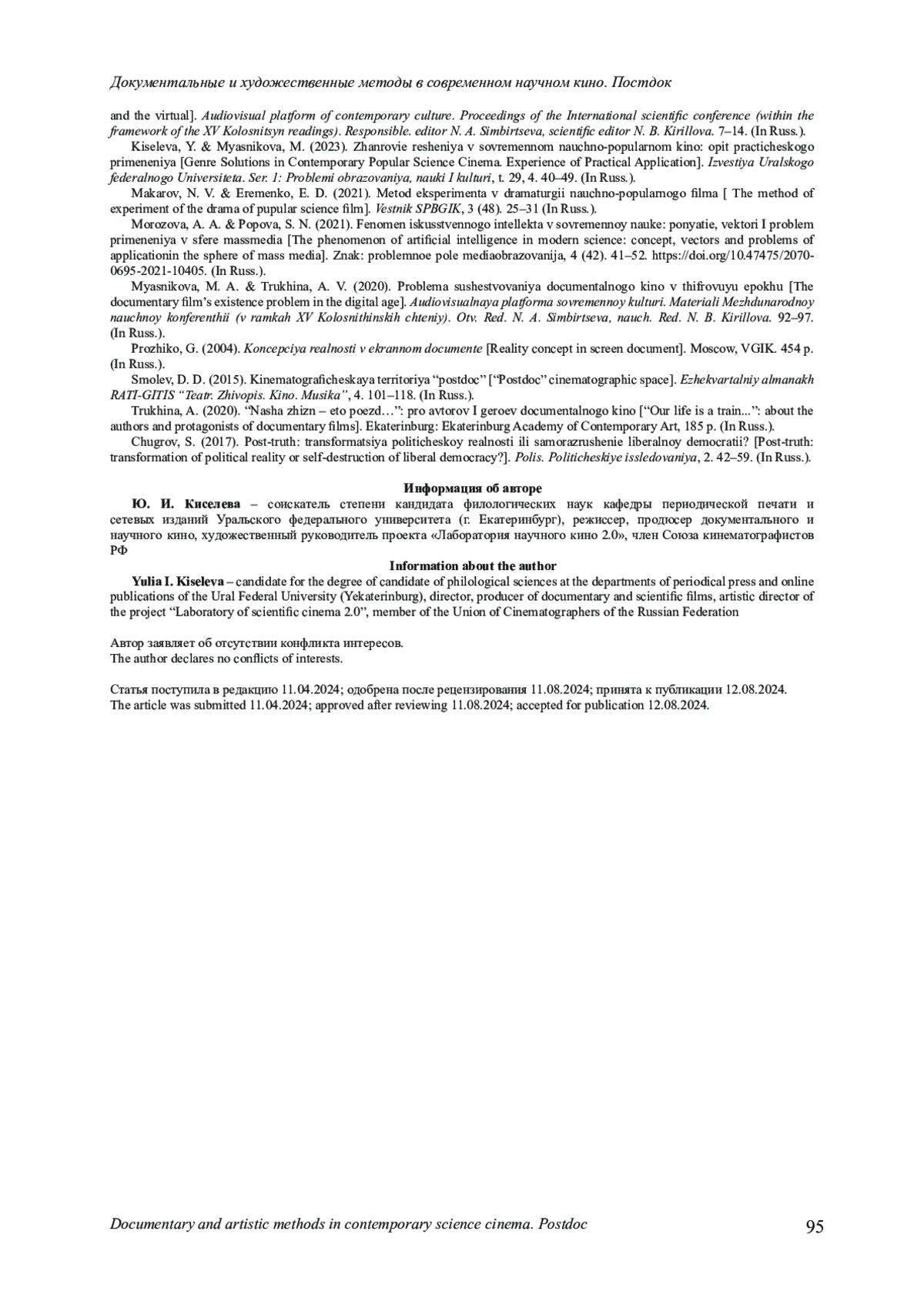 11. Киселева Ю. И., Мясникова М. А. Жанровые решения в современном научно-популярном кино: опыт практического применения // Известия Уральского федерального университета, 2023. Сер. 1: Проблемы образования, науки и культуры. Т. 29, № 4. С. 40-49. EDN: LDZQRN