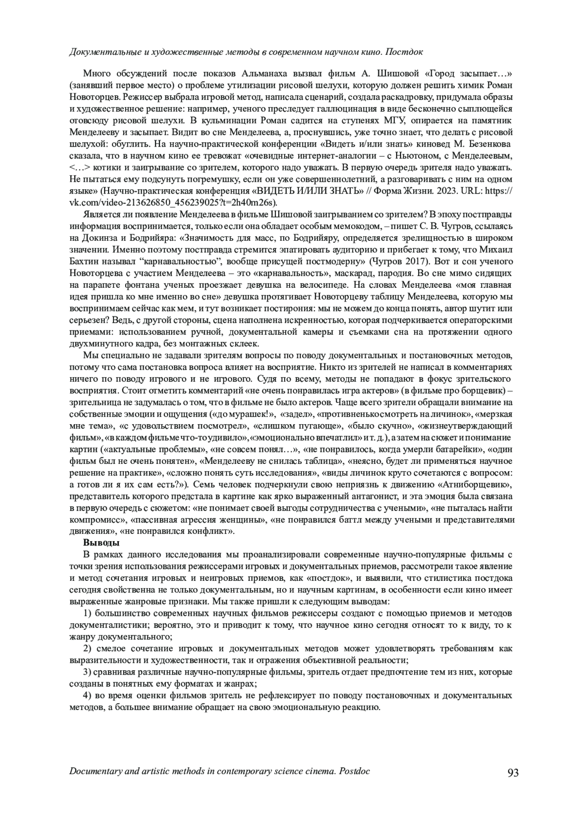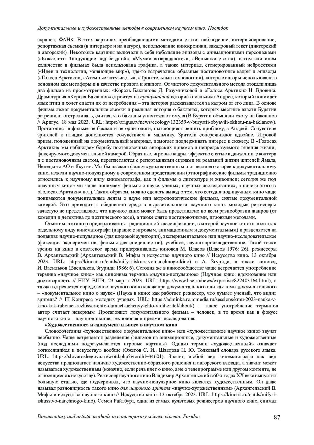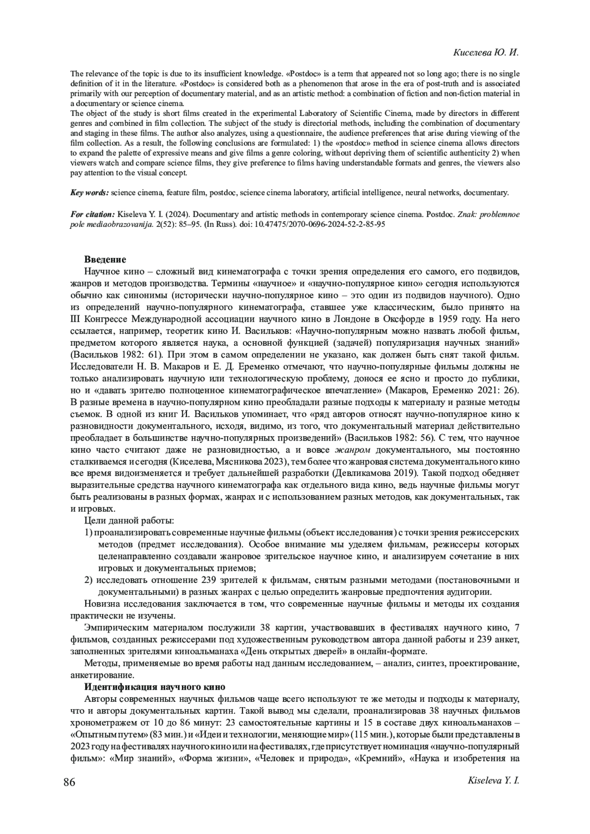 11. Киселева Ю. И., Мясникова М. А. Жанровые решения в современном научно-популярном кино: опыт практического применения // Известия Уральского федерального университета, 2023. Сер. 1: Проблемы образования, науки и культуры. Т. 29, № 4. С. 40-49. EDN: LDZQRN