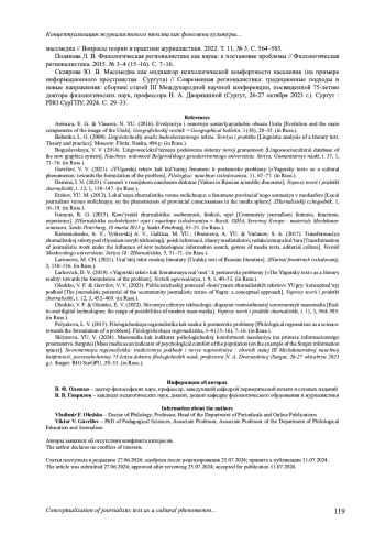 14. Склярова Ю. В. Массмедиа как индикатор психологической комфортности населения (на примере информационного пространства Сургута) // Современная регионалистика: традиционные подходы и новые направления: сборник статей III Международной научной конференции, посвященной 75-летию доктора филологических наук, профессора Н. А. Дворяшиной (Сургут, 26-27 октября 2023 г.). Сургут: РИО СурГПУ, 2024. С. 29-33. EDN: KFERIC
