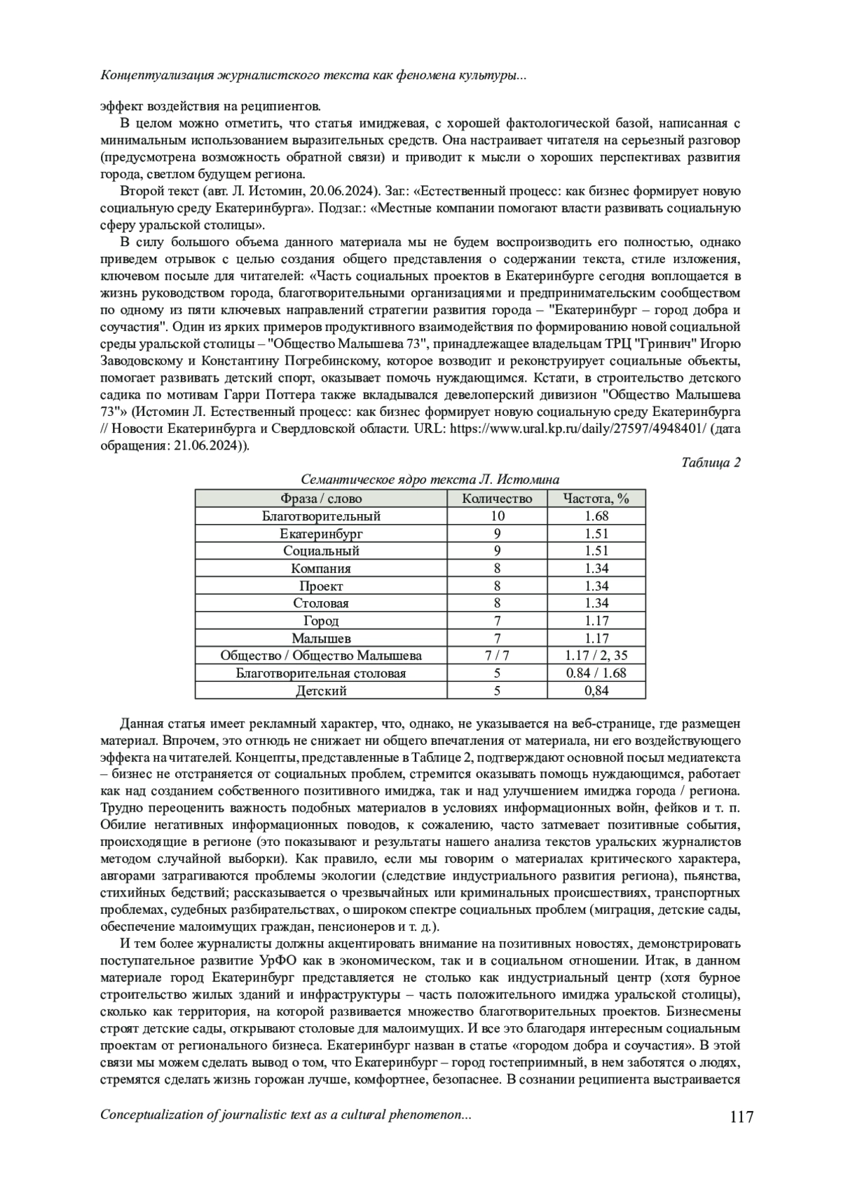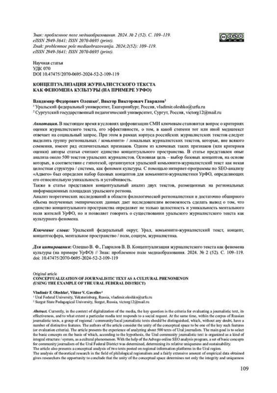 В настоящее время в условиях цифровизации СМИ ключевым становится вопрос о критериях оценки журналистского текста, его эффективности, о том, в какой степени тот или иной медиатекст отвечает на социальный запрос. При этом в рамках корпуса российских журналистских текстов следует выделить группу региональных / комьюнити- / локальных журналистских текстов, которые, вне всякого сомнения, имеют ряд отличительных признаков. Одним из ключевых таких признаков (или критериев оценки) авторы статьи считают единство концептуального пространства. В статье представлен опыт анализа около 500 текстов уральских журналистов. Основная цель - выбор базовых концептов, на основе которых, в соответствии с гипотезой, организуется уральский комьюнити-журналистский текст как некая целостная структура / система, как феномен культуры. С помощью интернет-программы по SEO-анализу «Адвего» был определен набор базовых концептов для комьюнити-журналистики УрФО, определяющих его относительную уникальность и устойчивость. Также в статье представлен концептуальный анализ двух текстов, размещенных на региональных информационных площадках уральского региона. Анализ теоретических исследований в области филологической регионалистики и достаточно обширного объема полученных эмпирических данных дает исследователям возможность сделать вывод о том, что единство концептуального пространства определяет не только целостность и уникальность ментального поля жителей УрФО, но и позволяет говорить о существовании уральского журналистского текста как культурного феномена.