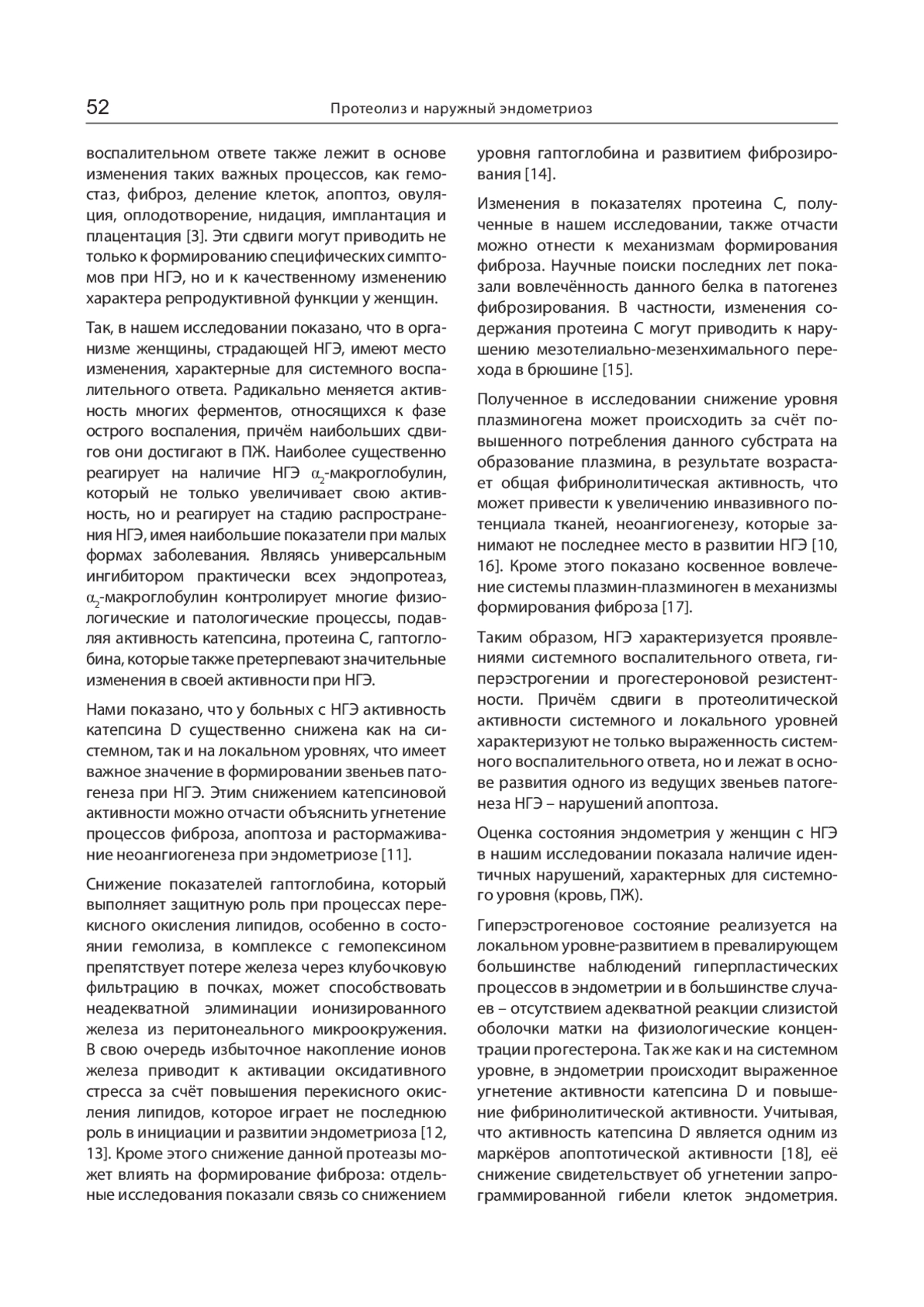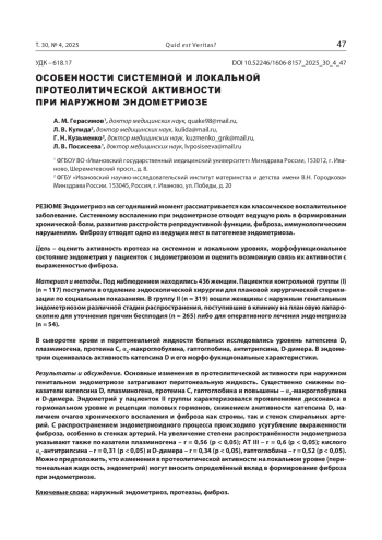 Результаты и обсуждение. Основные изменения в протеолитической активности при наружном генитальном эндометриозе затрагивают перитонеальную жидкость. Существенно снижены показатели катепсина D, плазминогена, протеина С, гаптоглобина и повышены – α2-макроглобулина и D-димера. Эндометрий у пациенток II группы характеризовался проявлениями диссонанса в гормональном уровне и рецепции половых гормонов, снижением акитивности катепсина D, наличием очагов хронического воспаления и фиброза как стромы, так и стенок спиральных артерий. С распространением эндометриоидного процесса происходило усугубление выраженности фиброза, особенно в стенках артерий. На увеличение степени распространённости эндометриоза указывают также показатели плазминогена – r = 0,56 (p < 0,05); АТ III – r = 0,6 (p < 0,05); кислого α1-антитрипсина – r = 0,31 (p < 0,05) и D-димера – r = 0,34 (p < 0,05), гаптоглобина – r = 0,52 (p < 0,05). Можно предположить, что изменения в протеолитической активности на локальном уровне (перитонеальная жидкость, эндометрий) могут вносить определённый вклад в формирование фиброза при эндометриозе.