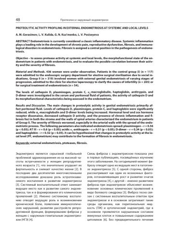 Цель – оценить активность протеаз на системном и локальном уровнях, морфофункциональное состояние эндометрия у пациенток с эндометриозом и оценить возможную связь их активности с выраженностью фиброза.