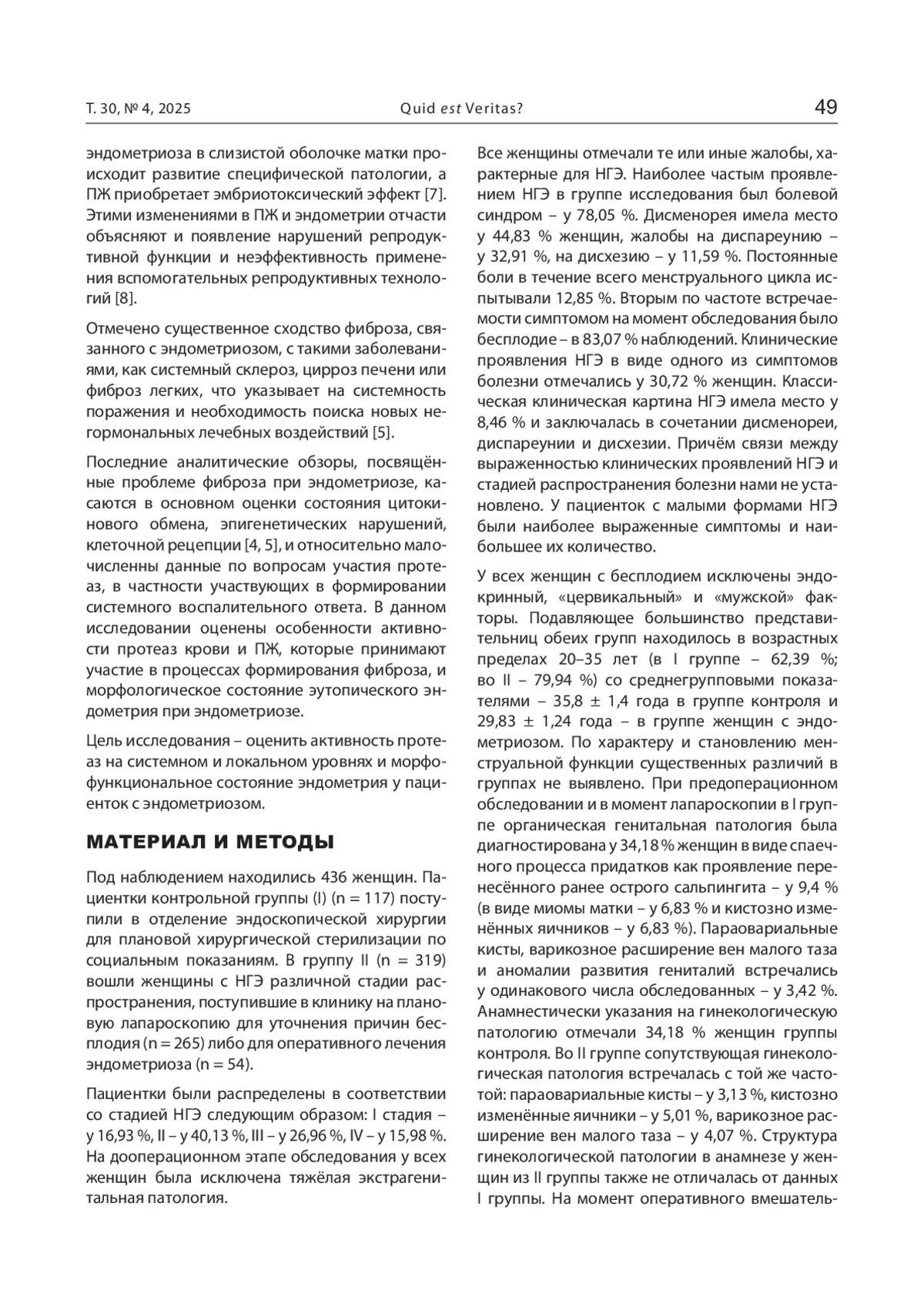 Материал и методы. Под наблюдением находились 436 женщин. Пациентки контрольной группы (I) (n = 117) поступили в отделение эндоскопической хирургии для плановой хирургической стерилизации по социальным показаниям. В группу II (n = 319) вошли женщины с наружным генитальным эндометриозом различной стадии распространения, поступившие в клинику на плановую лапароскопию для уточнения причин бесплодия (n = 265) либо для оперативного лечения эндометриоза (n = 54). В сыворотке крови и перитонеальной жидкости больных исследовались уровень катепсина D, плазминогена, протеина С, α2-макроглобулина, гаптоглобина, антитрипсина, D-димера. В эндометрии оценивалась активность катепсина D и его морфофукнциональные характеристики.