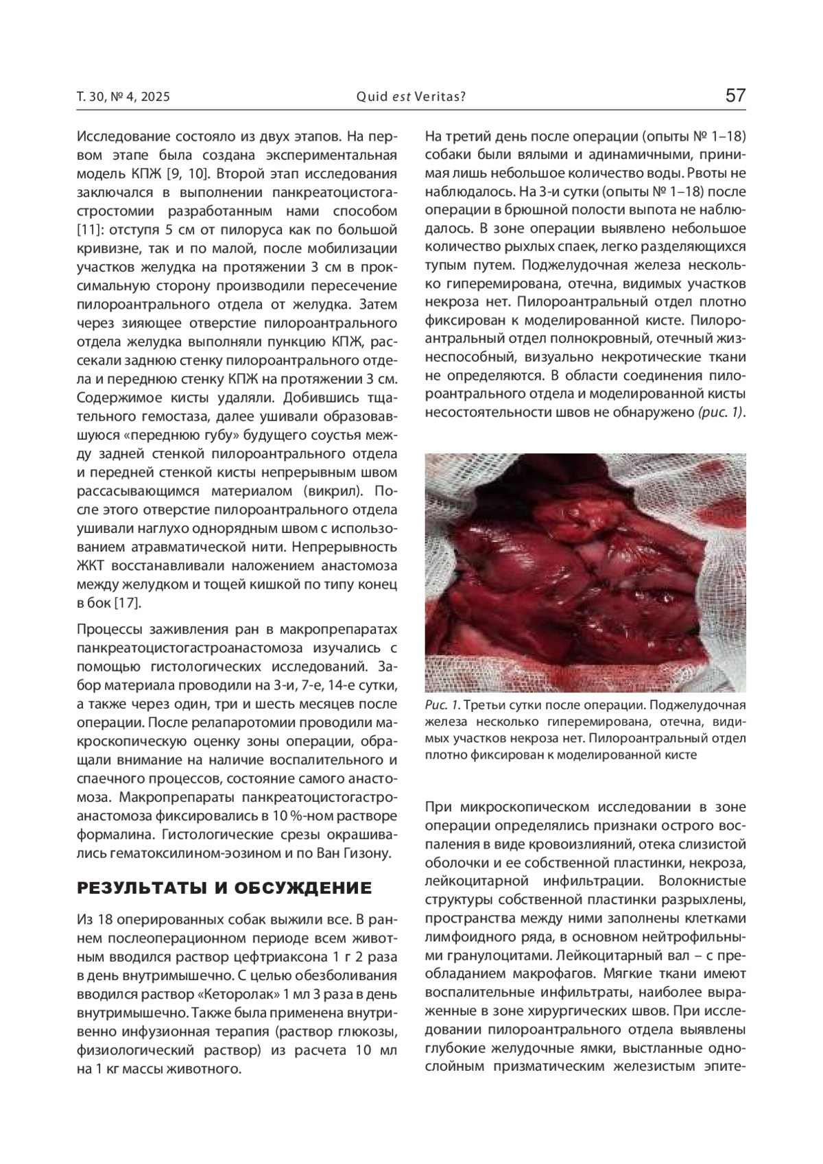 Материал и методы. В эксперименте на 18 беспородных собаках в сроки 3-и, 7-е, 14-е сутки и один, три, шесть месяцев после операции изучены патоморфологические изменения в зоне панкреатоцистогастростомии. После релапаротомии обращали внимание на наличие воспалительных и спаечных процессов в зоне операции, состояние самого анастомоза. Макропрепараты панкреатоцистогастроанастомоза фиксировались в 10 %-ном растворе формалина. Гистологические срезы окрашивались гематоксилином-эозином и по Ван Гизону.