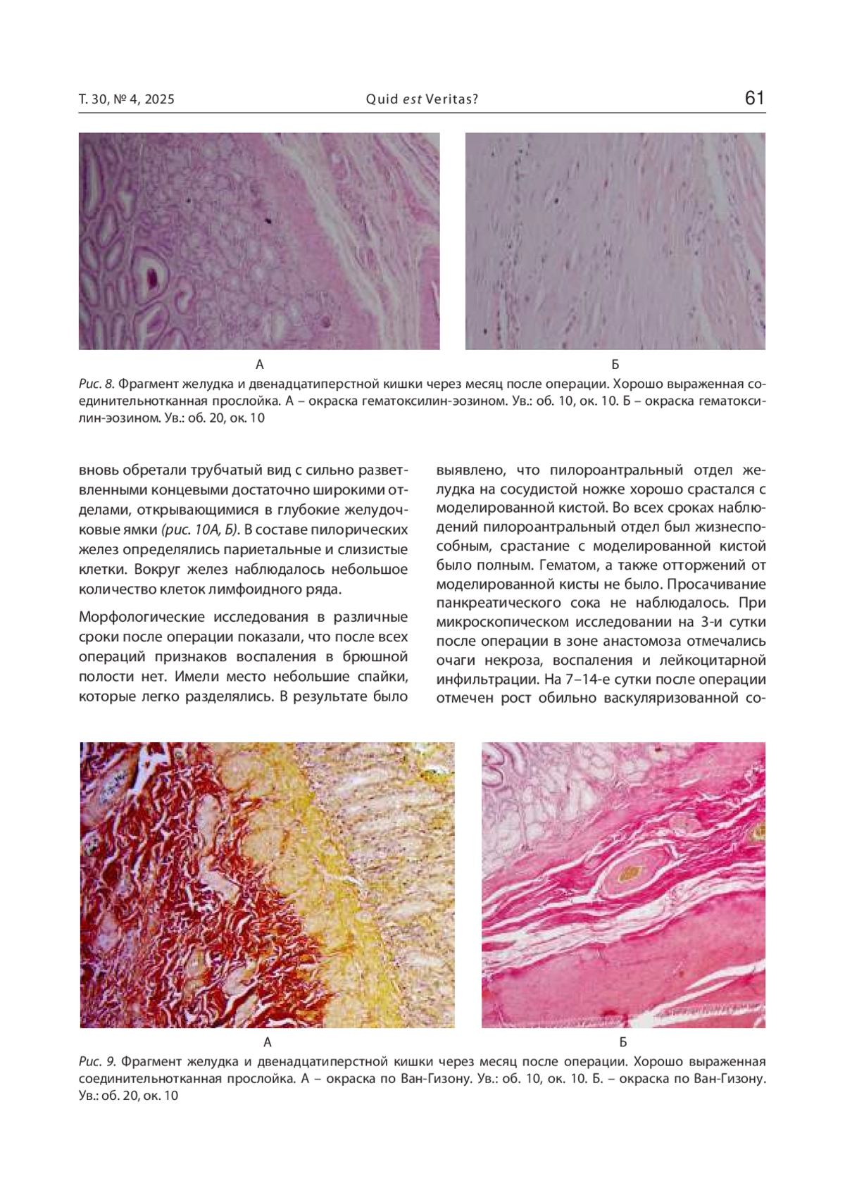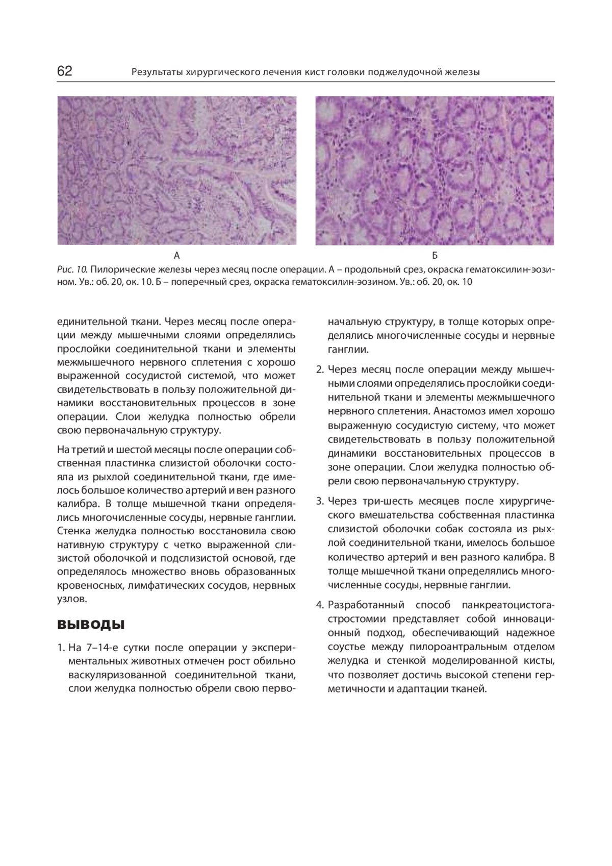 Результаты и обсуждение. Морфологические исследования показали, что процессы образования молодой васкуляризированной соединительной ткани приходились на 7–14-е сутки. К месяцу между мышечными слоями определялись прослойки соединительной ткани и элементы межмышечного нервного сплетения и выраженной сосудистой системы, что свидетельствовало о положительной динамике восстановительных процессов в зоне операции. Слои желудка полностью приобретали свою первоначальную структуру. На третий и шестой месяцы собственная пластинка слизистой оболочки состояла из рыхлой соединительной ткани, где имелось большое количество артерий и вен разного калибра. В толще мышечной ткани определялись многочисленные сосуды, нервные ганглии. Желудок полностью восстанавливал свою исходную структуру с четко выраженной слизистой оболочкой и подслизистой основой, где определялось множество вновь образованных кровеносных, лимфатических сосудов, нервных узлов.