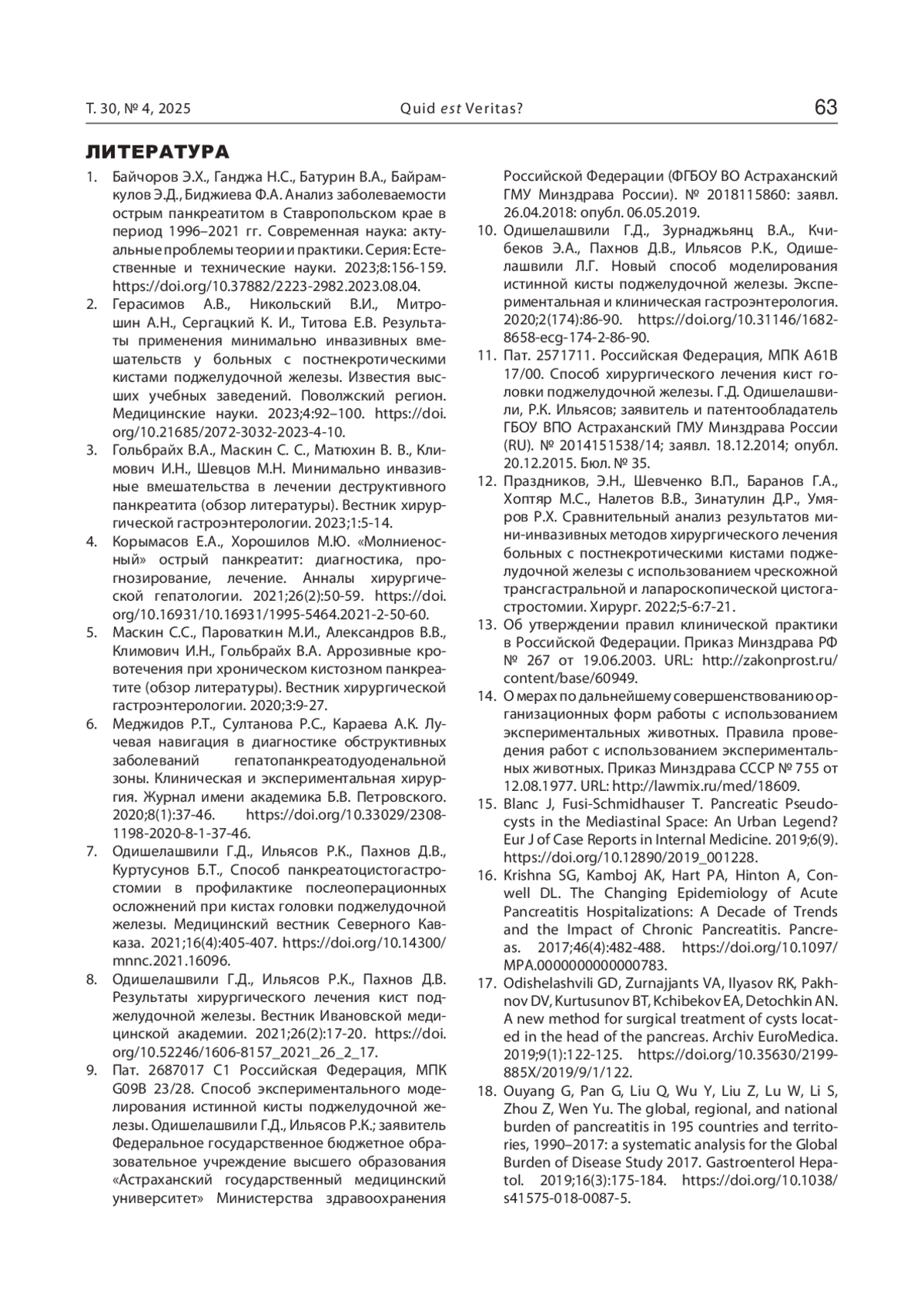 8. Одишелашвили Г.Д., Ильясов Р.К., Пахнов Д.В. Результаты хирургического лечения кист поджелудочной железы. Вестник Ивановской медицинской академии. 2021;26(2):17-20. DOI: 10.52246/1606-8157_2021_26_2_17