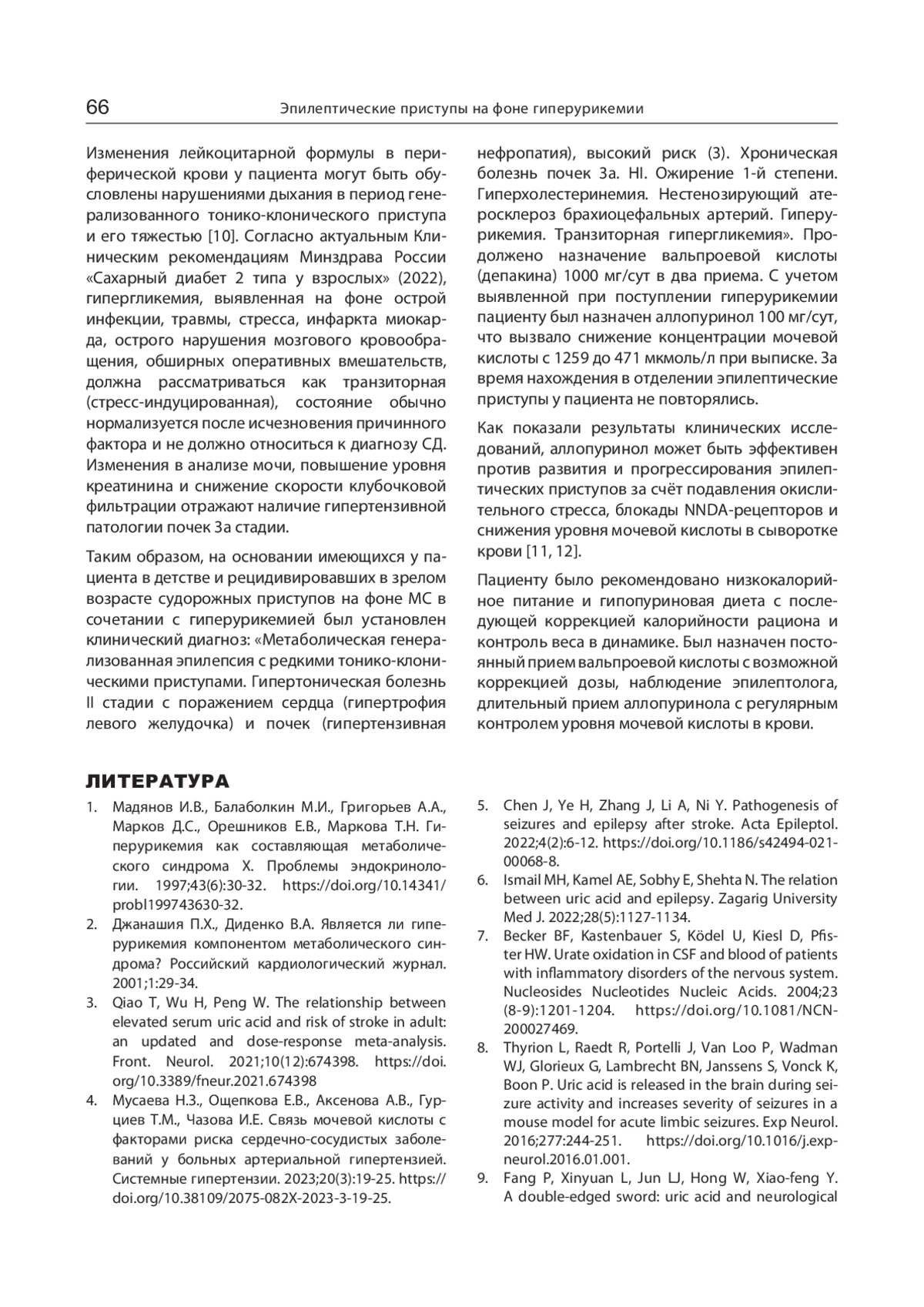 2. Джанашия П.Х., Диденко В.А. Является ли гиперурикемия компонентом метаболического синдрома? Российский кардиологический журнал. 2001;1:29-34.