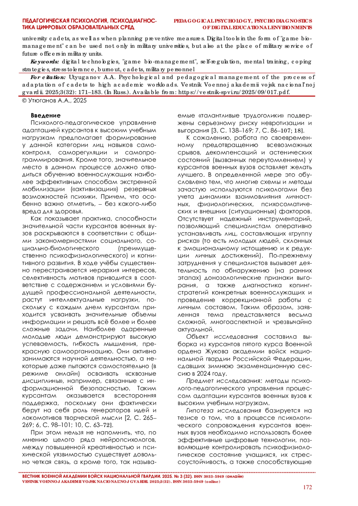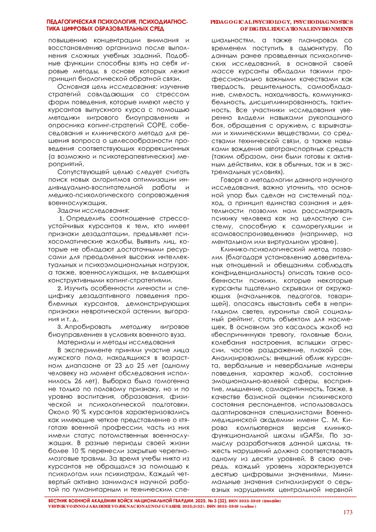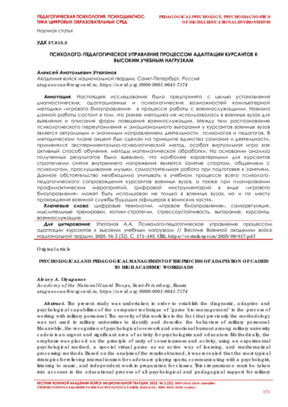 Настоящее исследование было предпринято с целью установления диагностических, адаптационных и психологических возможностей компьютерной методики «игрового биоуправления» в процессе работы с военнослужащими. Новизна данной работы состоит в том, что ранее методика не использовалась в военных вузах для выявления и описания форм поведения военнослужащих. Между тем распознавание психологиеского переутомления и эмоционального выгорания у курсантов военных вузов является актуальным и значимым направлением деятельности психологов и педагогов. В методическом плане акцент был сделан на принципе единства сознания и деятельности, применялся экспериментально-психологический метод, особая виртуальная игра как активный способ обучения, методы математической обработки. На основании анализа полученных результатов было выявлено, что наиболее характерными для курсантов стратегиями снятия внутреннего напряжения являются занятие спортом, общением с психологом, прослушивание музыки, самостоятельная работа при подготовке к занятиям. Данное обстоятельство необходимо учитывать в учебном процессе всего психолого-педагогического сопровождения курсантов военных вузов, а также при планировании профилактических мероприятий. Цифровой инструментарий в виде «игрового биоуправления» может быть использован не только в военных вузах, но и по месту прохождения военной службы будущих офицеров в воинских частях.