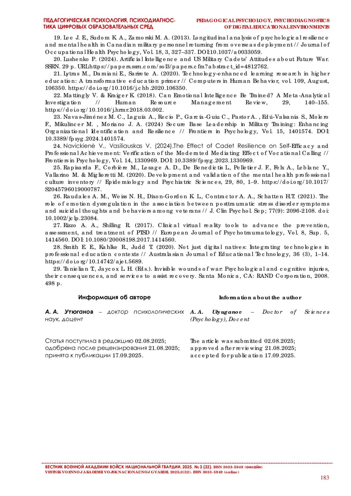 24. Navickienė V.The Effect of Cadet Resilience on Self-Efficacy and Professional Achievement: Verification of the Moderated Mediating Effect of Vocational Calling // Frontiers in Psychology, Vol. 14, 1330969.