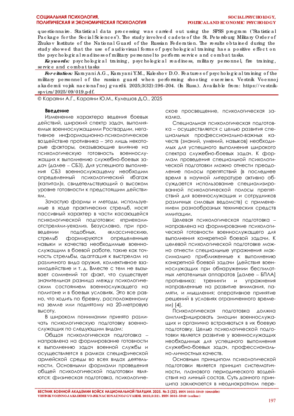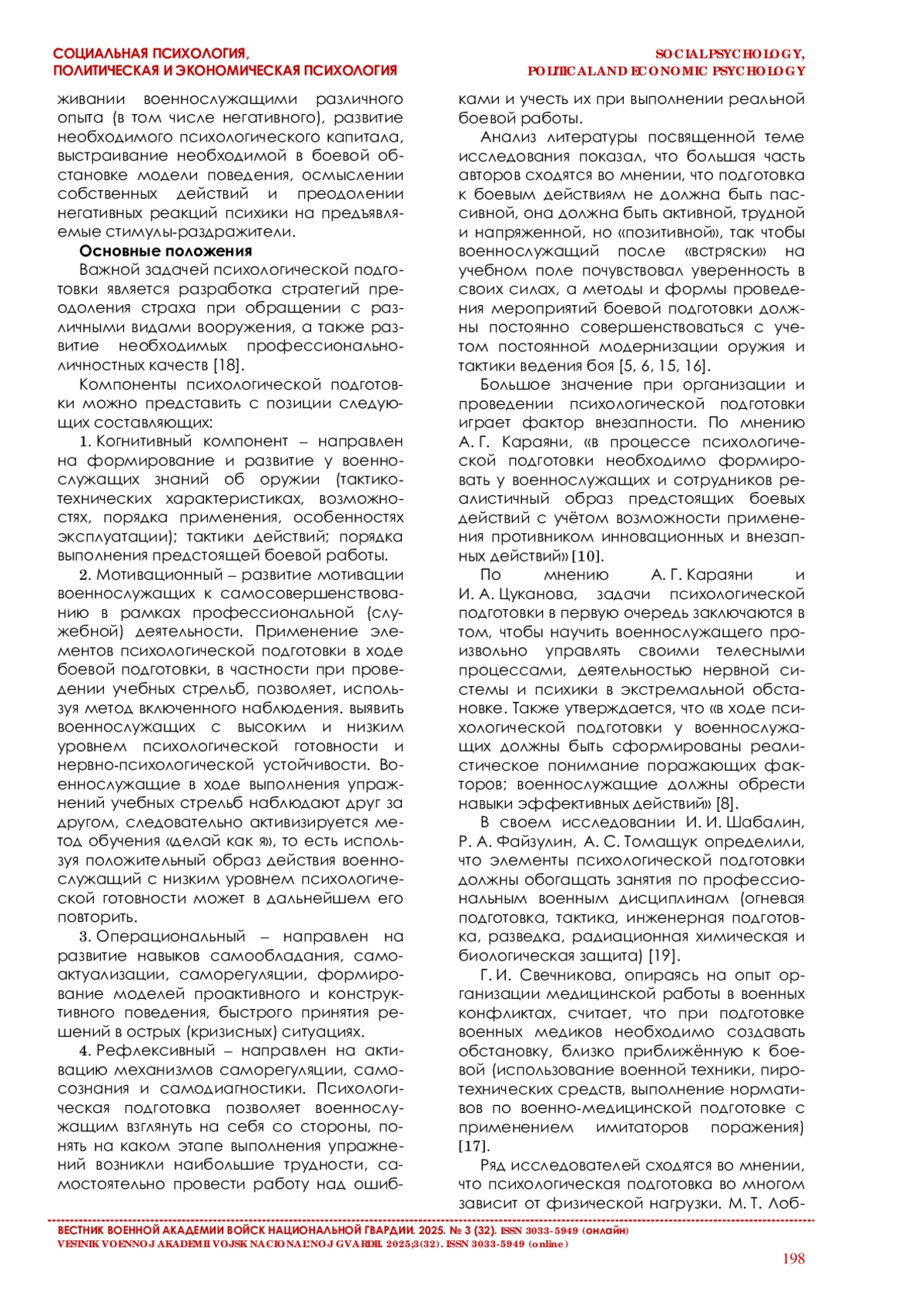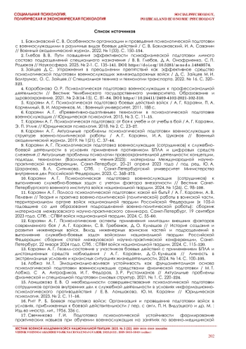 Karayani A. G. Polosa psihologicheskoj podgotovki: kakoj ej byt’?// Teoriya i praktika voenno-politicheskoj (politicheskoj) raboty v voinskoj chasti, territorial’nom organe vojsk nacional’noj gvardii Rossijskoj Federacii. SPb., 2024. S. 55-60. (In Russ.).