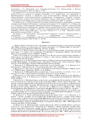 1. Баклановский С. В. Особенности организации и проведения психологической подготовки с военнослужащими в различных видах боевых действий / С. В. Баклановский, И. А. Саванин // Военный академический журнал. 2022. № 1(33). С. 150-154.