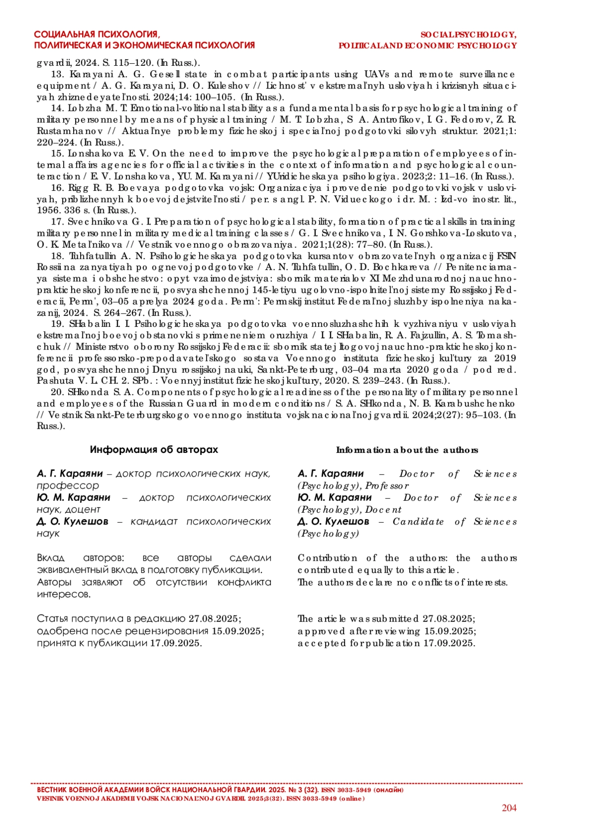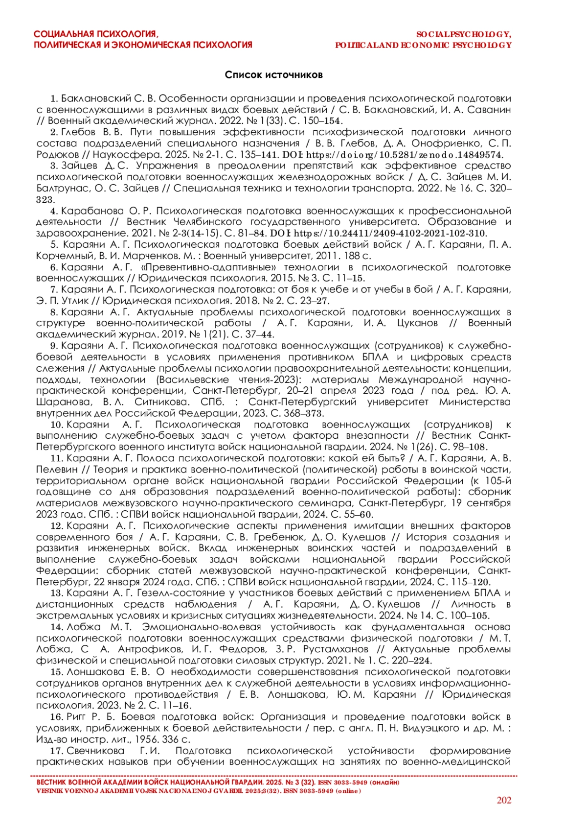 9. Караяни А. Г. Психологическая подготовка военнослужащих (сотрудников) к служебно-боевой деятельности// Актуальные проблемы психологии правоохранительной деятельности. СПб., 2023. С. 368-373.