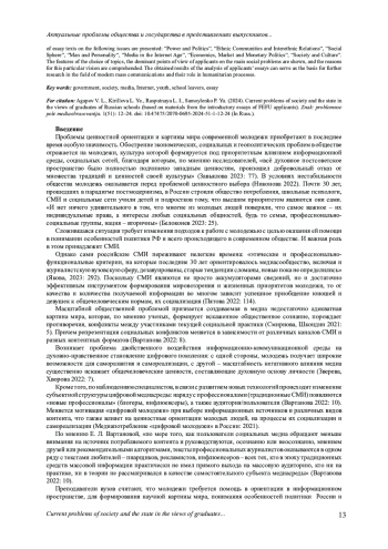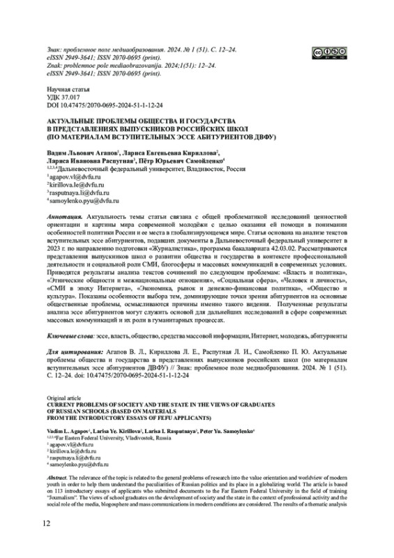 Актуальность темы статьи связана с общей проблематикой исследований ценностной ориентации и картины мира современной молодёжи с целью оказания ей помощи в понимании особенностей политики России и ее места в глобализирующемся мире. Статья основана на анализе текстов вступительных эссе абитуриентов, подавших документы в Дальневосточный федеральный университет в 2023 г. по направлению подготовки «Журналистика», программа бакалавриата 42.03.02. Рассматриваются представления выпускников школ о развитии общества и государства в контексте профессиональной деятельности и социальной роли СМИ, блогосферы и массовых коммуникаций в современных условиях. Приводятся результаты анализа текстов сочинений по следующим проблемам: «Власть и политика»,«Этнические общности и межнациональные отношения», «Социальная сфера», «Человек и личность»,«СМИ в эпоху Интернета», «Экономика, рынок и денежно-финансовая политика», «Общество и культура». Показаны особенности выбора тем, доминирующие точки зрения абитуриентов на основные общественные проблемы, осмысливаются причины именно такого видения. Полученные результаты анализа эссе абитуриентов могут служить основой для дальнейших исследований в сфере современных массовых коммуникаций и их роли в гуманитарных процессах.