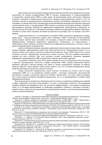 20. Пятова А. В. Роль масс-медиа в формировании ценностных ориентаций молодежи // Общество: философия, история, культура. 2022. № 10. С. 114-118. EDN: EYBUWX