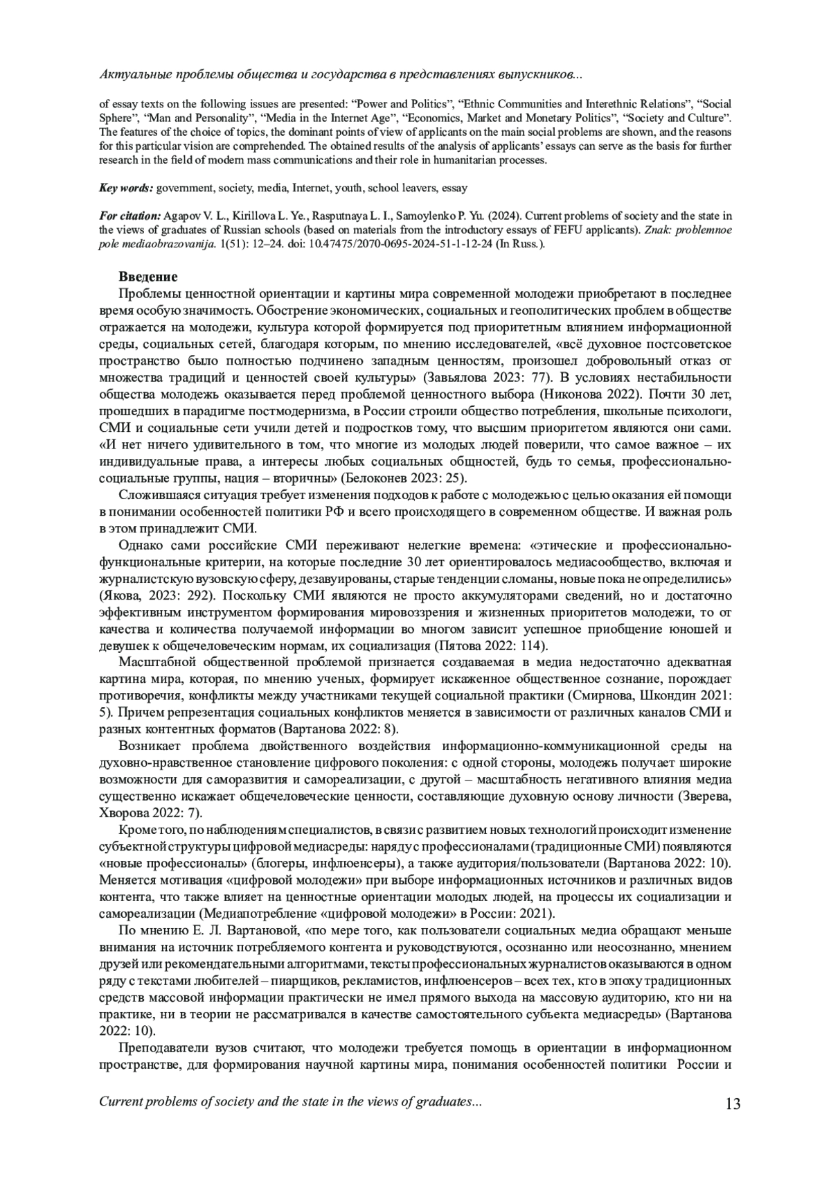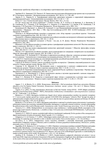 12. Зверева Е. А., Хворова В. А. Трансформация ценностных ориентиров молодежи в современной информационно-коммуникационной среде // Коммуникативные исследования. 2022. Т. 9, № 1.С. 7-28. EDN: ADFVBN