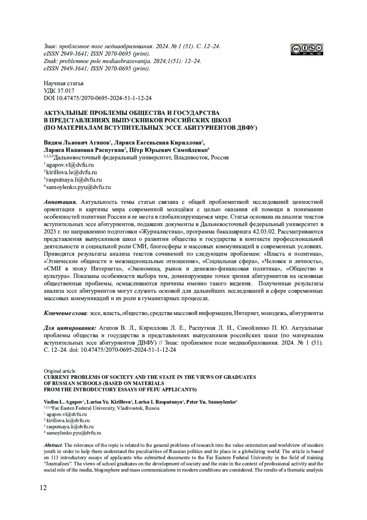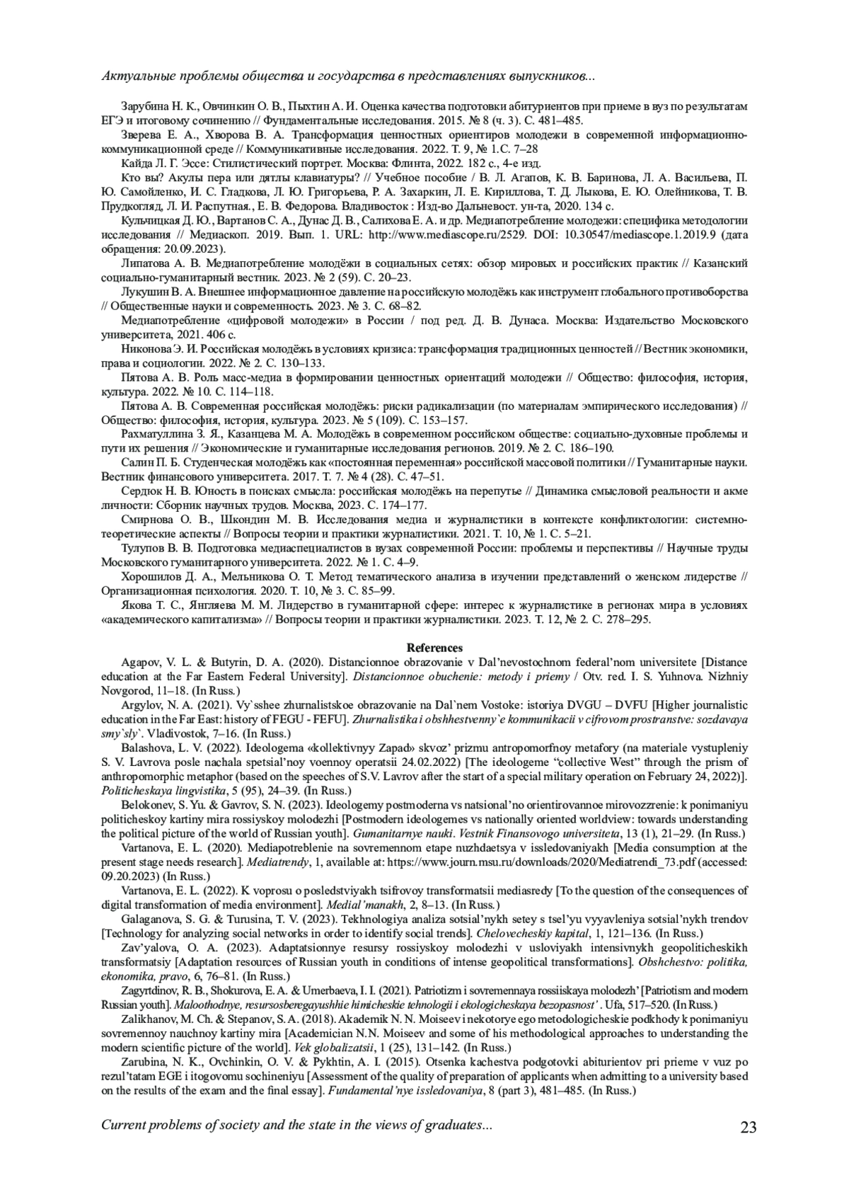 2. Аргылов Н. А. Высшее журналистское образование на Дальнем Востоке: история ДВГУ - ДВФУ // Журналистика и общественные коммуникации в цифровом пространстве: создавая смыслы. Владивосток, 2021. С. 7-16. EDN: UUZZIW