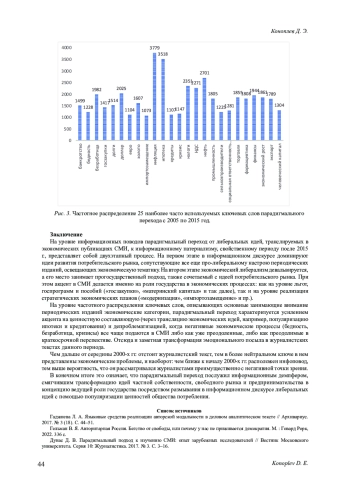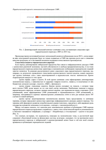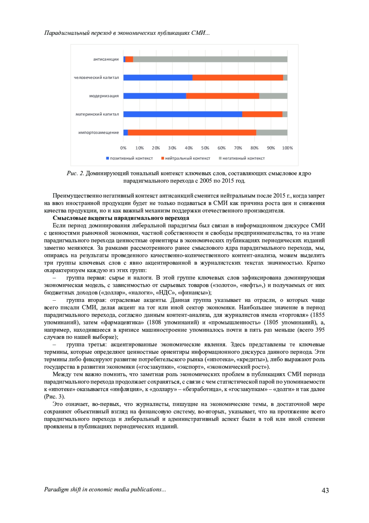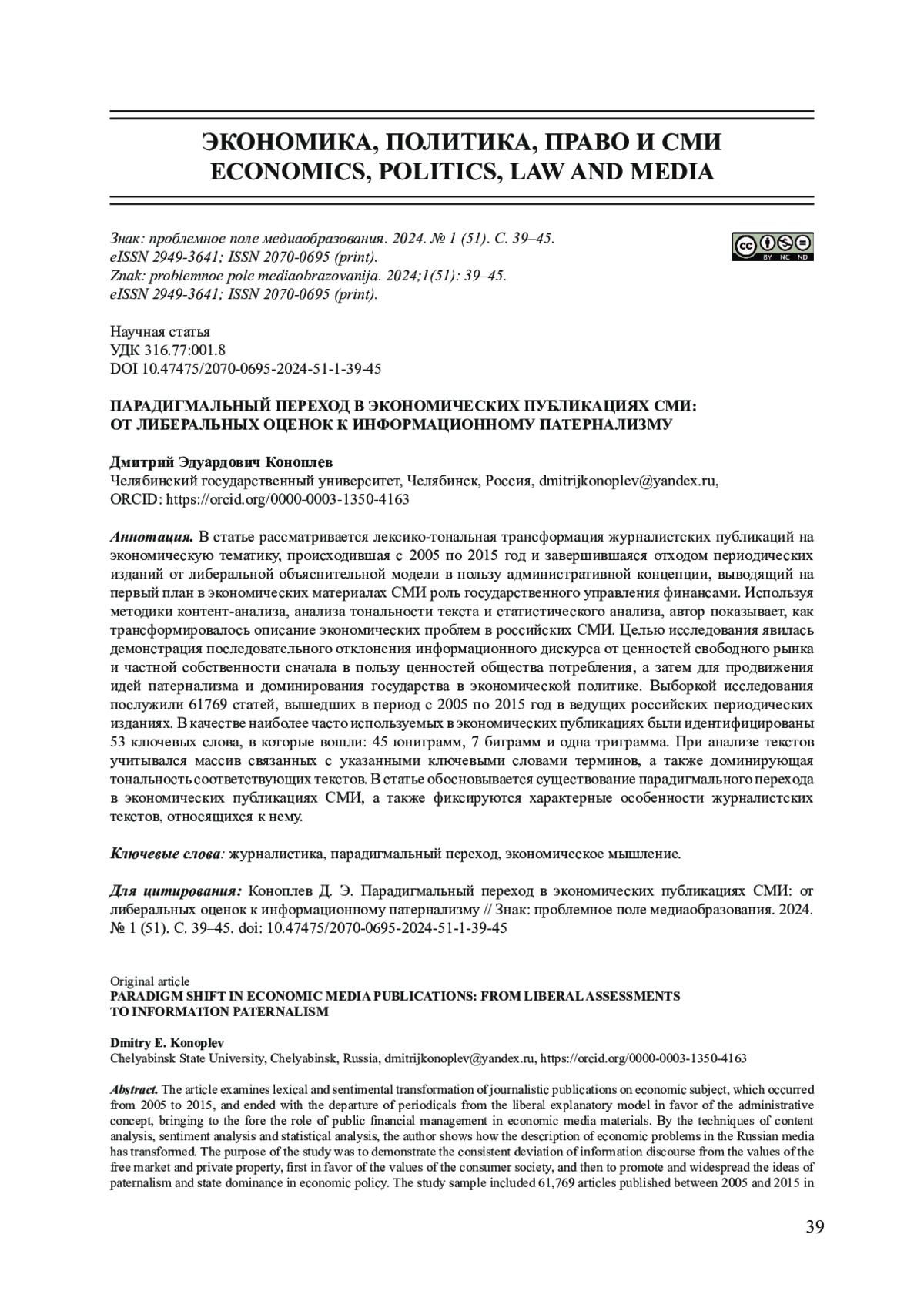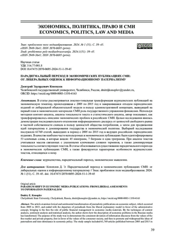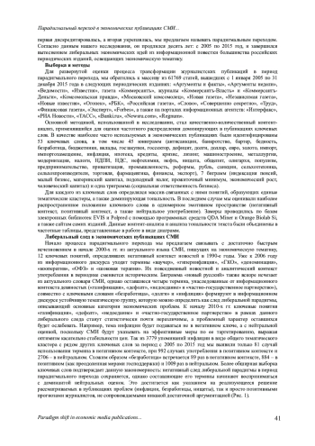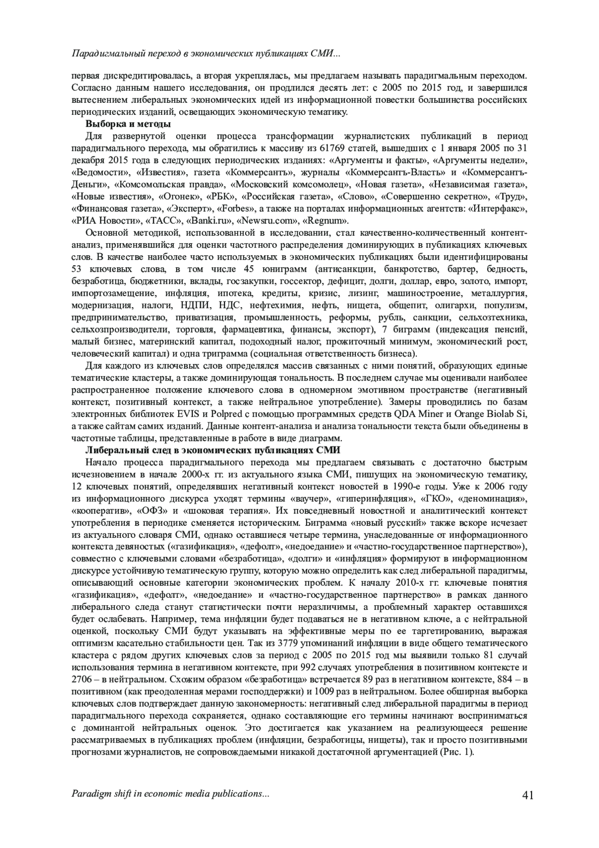 В статье рассматривается лексико-тональная трансформация журналистских публикаций на экономическую тематику, происходившая с 2005 по 2015 год и завершившаяся отходом периодических изданий от либеральной объяснительной модели в пользу административной концепции, выводящий на первый план в экономических материалах СМИ роль государственного управления финансами. Используя методики контент-анализа, анализа тональности текста и статистического анализа, автор показывает, как трансформировалось описание экономических проблем в российских СМИ. Целью исследования явилась демонстрация последовательного отклонения информационного дискурса от ценностей свободного рынка и частной собственности сначала в пользу ценностей общества потребления, а затем для продвижения идей патернализма и доминирования государства в экономической политике. Выборкой исследования послужили 61769 статей, вышедших в период с 2005 по 2015 год в ведущих российских периодических изданиях. В качестве наиболее часто используемых в экономических публикациях были идентифицированы 53 ключевых слова, в которые вошли: 45 юниграмм, 7 биграмм и одна триграмма. При анализе текстов учитывался массив связанных с указанными ключевыми словами терминов, а также доминирующая тональность соответствующих текстов. В статье обосновывается существование парадигмального перехода в экономических публикациях СМИ, а также фиксируются характерные особенности журналистских текстов, относящихся к нему.