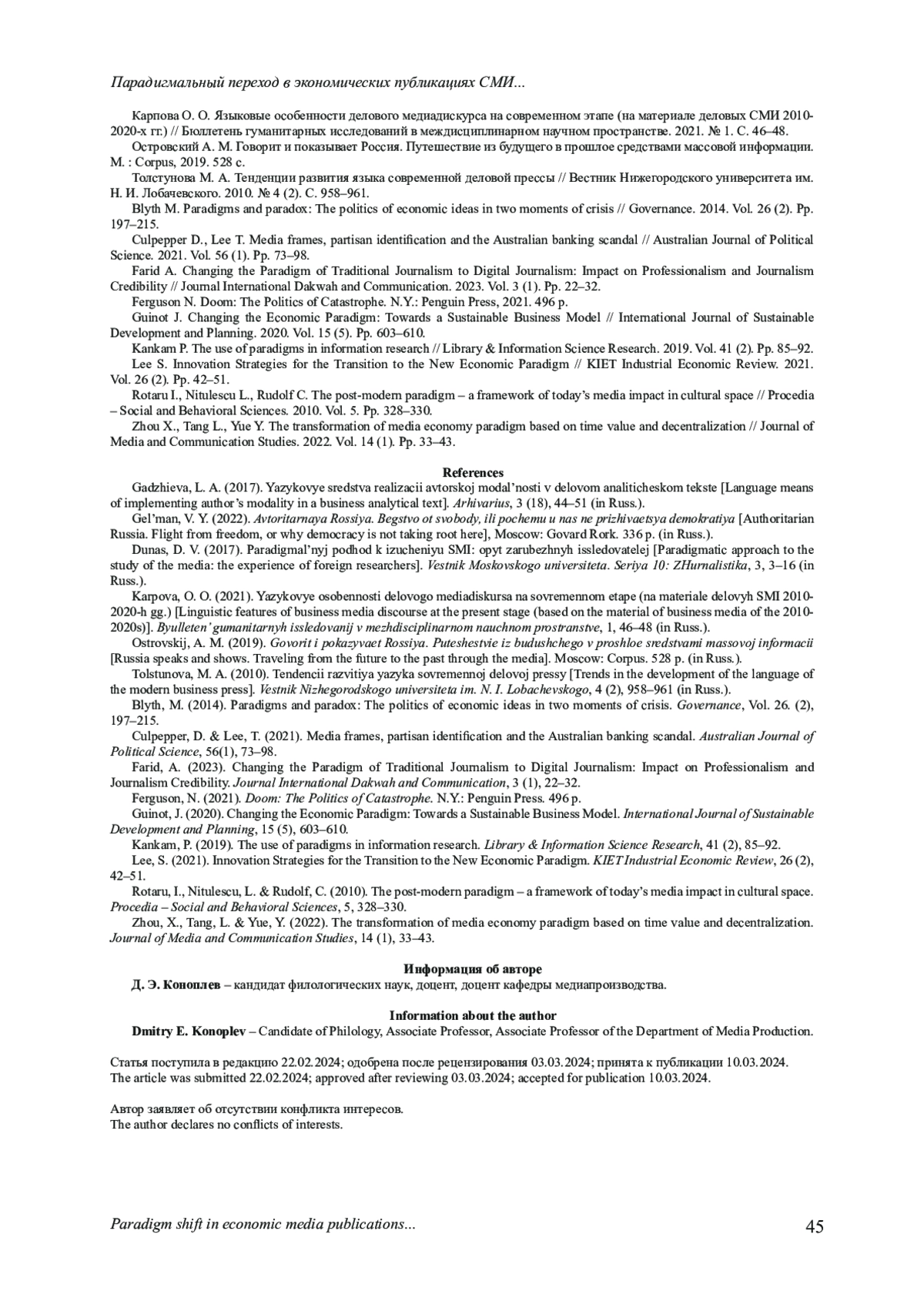 4. Карпова О. О. Языковые особенности делового медиадискурса на современном этапе (на материале деловых СМИ 2010-2020-х гг.) // Бюллетень гуманитарных исследований в междисциплинарном научном пространстве. 2021. № 1. С. 46-48. EDN: WBJQLO