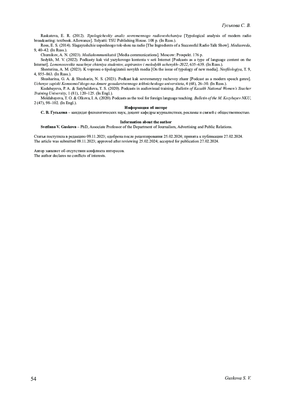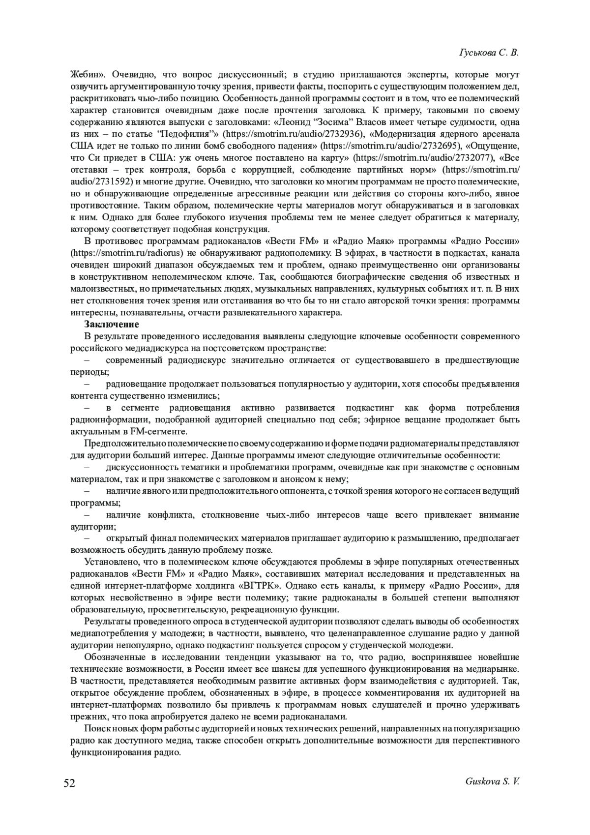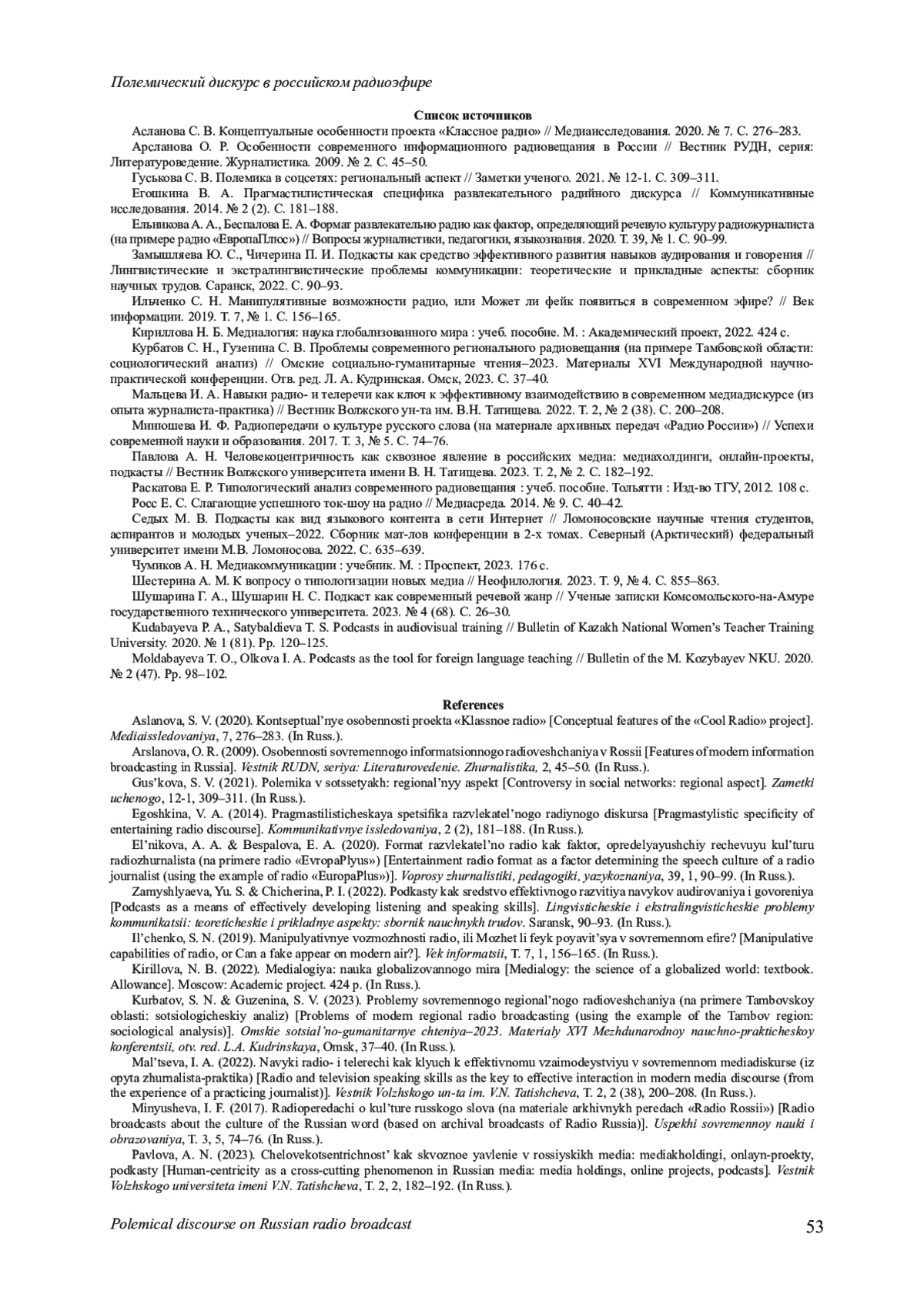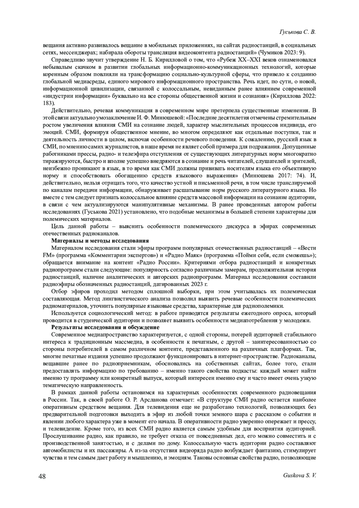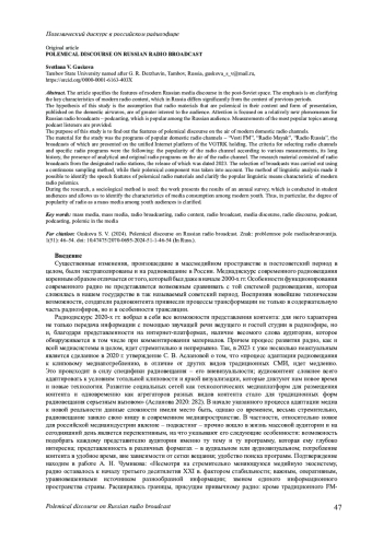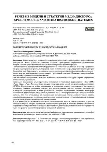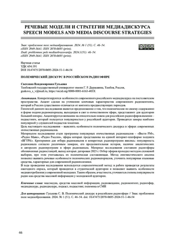 Конкретизируются особенности современного российского медиадискурса на постсоветском пространстве. Акцент сделан на уточнении ключевых характеристик современного радиоконтента, который в России существенно отличается от контента предшествующих периодов. Гипотезой данного исследования является предположение о том, что полемические по своему содержанию и форме подачи радиоматериалы, выходящие в свет в отечественном эфире, представляют для аудитории больший интерес. Акцентируется внимание на относительно новом для российских радиоэфиров явлении - подкастинге, который пользуется популярностью у российской аудитории. Приводятся замеры наиболее популярной у слушателей подкастов тематики. Цель настоящего исследования - выяснить особенности полемического дискурса в эфирах современных отечественных радиоканалов. Материалом исследования стали программы популярных отечественных радиоканалов - «Вести FM»,«Радио Маяк», «Радио России», эфиры которых представлены на единой интернет-платформе холдинга«ВГТРК». Критериями для отбора радиоканалов и конкретных радиопрограмм явились: популярность радиоканала согласно различным замерам, его продолжительная история, наличие аналитических и авторских радиопрограмм в эфире радиоканала. Материал исследования составили радиоэфиры обозначенных радиостанций, выход которых датирован 2023 г. Отбор эфиров проходил методом сплошной выборки, при этом учитывалась их полемическая составляющая. Метод лингвистического анализа позволил выявить речевые особенности полемических радиоматериалов, уточнить популярные языковые средства, характерные для современной радиополемики. В ходе проведения исследования используется социологический метод: в работе приводятся результаты ежегодного опроса, который проводится в студенческой аудитории и позволяет выявить особенности медиапотребления у современной молодежи. Таким образом, в частности, уточняется степень популярности радио как средства массовой информации у молодежной аудитории.