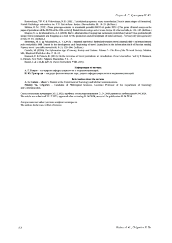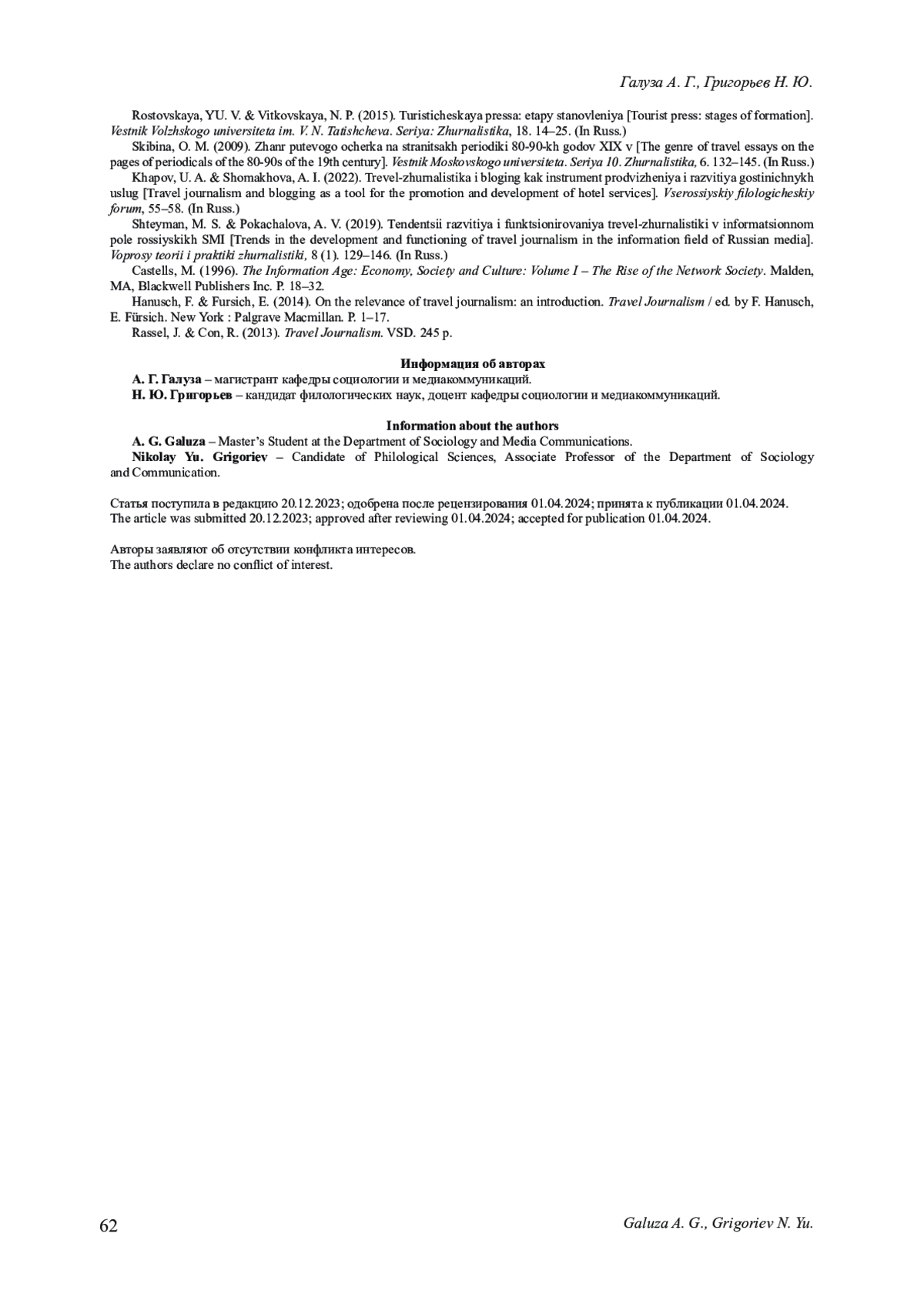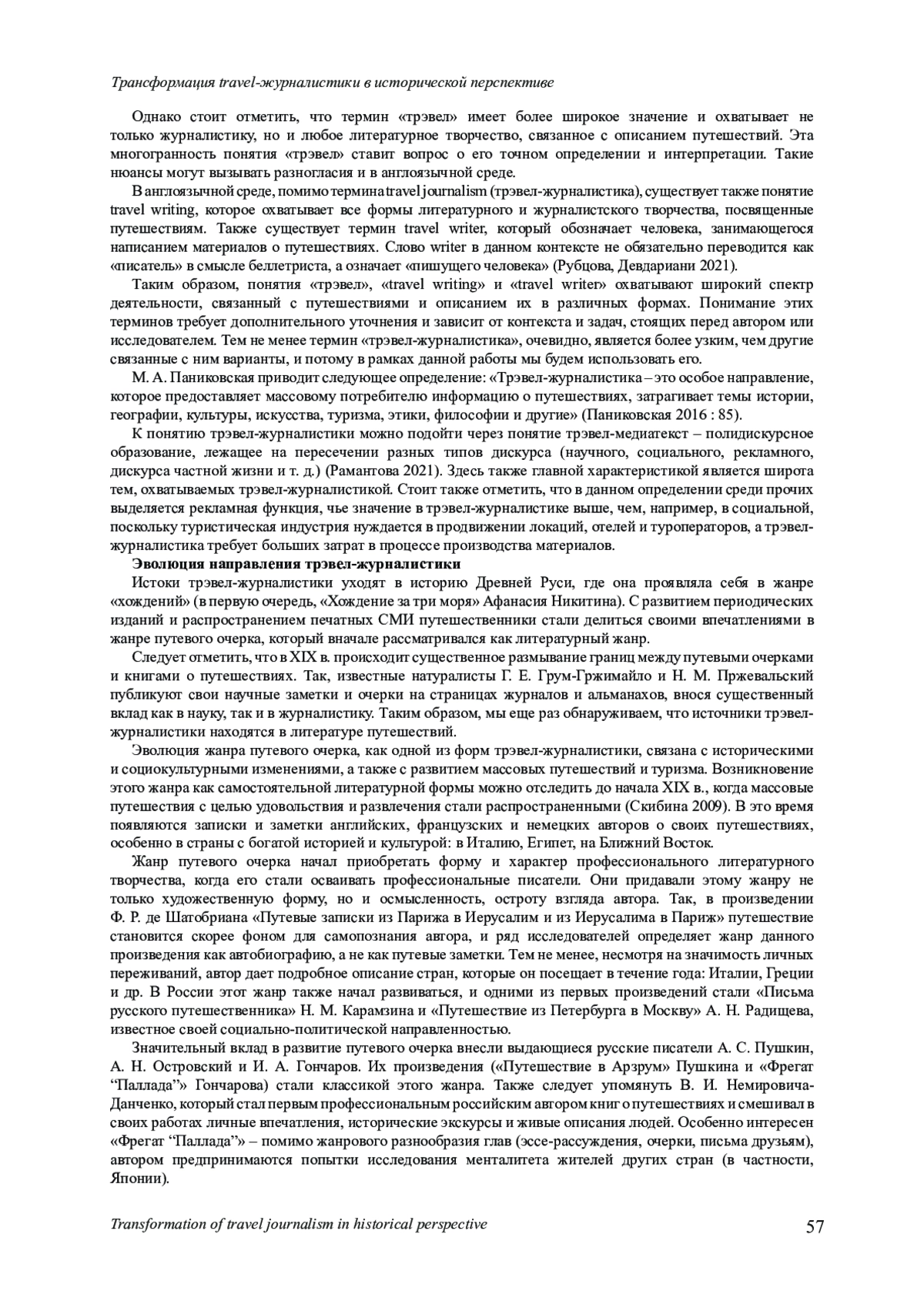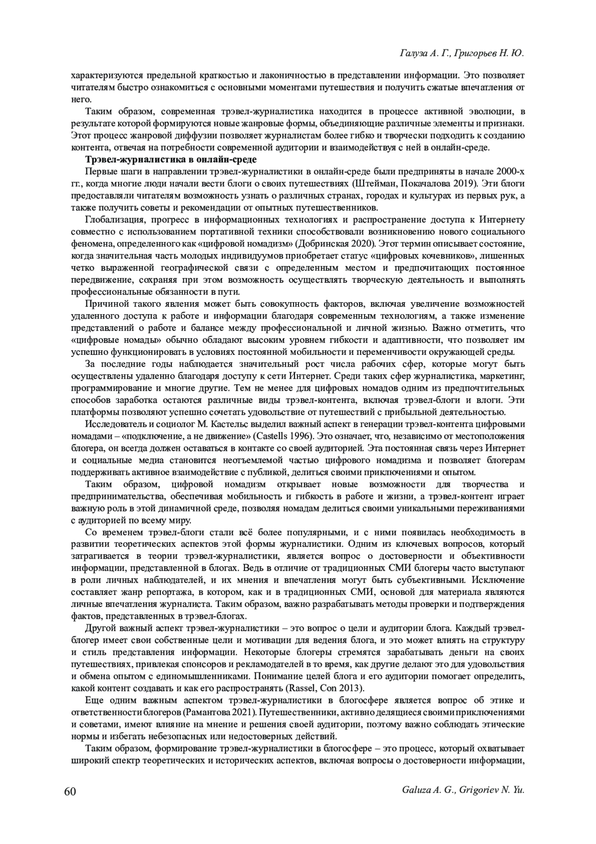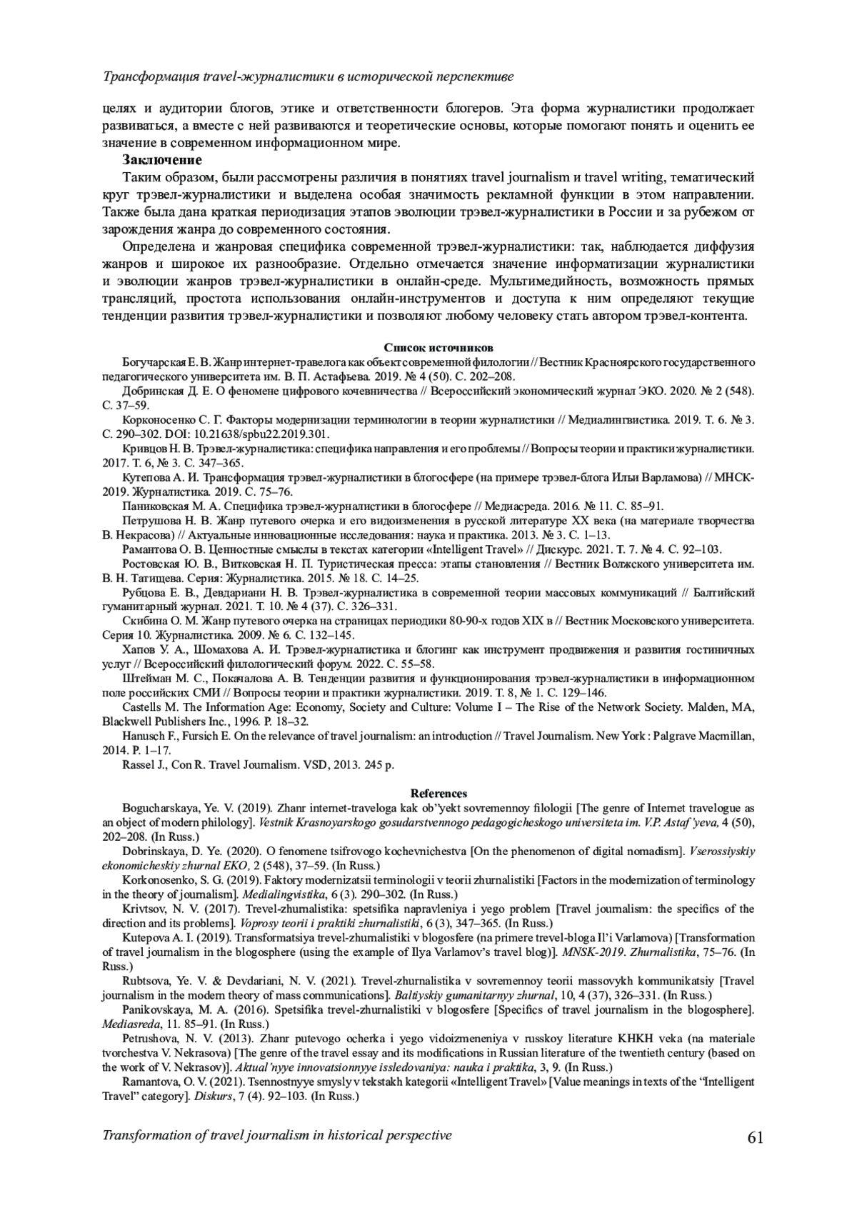 10. Рубцова Е. В., Девдариани Н. В. Трэвел-журналистика в современной теории массовых коммуникаций // Балтийский гуманитарный журнал. 2021. Т. 10. № 4 (37). С. 326-331. EDN: ZTUJFJ