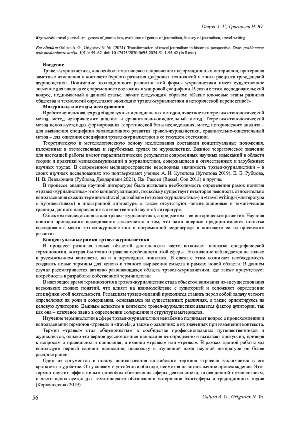 4. Кривцов Н. В. Трэвел-журналистика: специфика направления и его проблемы // Вопросы теории и практики журналистики. 2017. Т. 6, № 3. С. 347-365. EDN: ZRORPL
