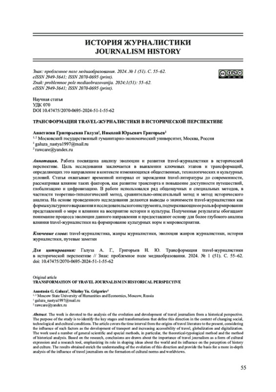 Работа посвящена анализу эволюции и развития travel-журналистики в исторической перспективе. Цель исследования заключается в выявлении ключевых этапов и трансформаций, определяющих это направление в контексте изменяющихся общественных, технологических и культурных условий. Статья охватывает временной интервал от зарождения travel-литературы до современности, рассматривая влияние таких факторов, как развитие транспорта и повышение доступности путешествий, глобализацию и цифровизацию. В работе использовался ряд общенаучных и специальных методов, в частности теоретико-типологический метод, сравнительно-описательный метод и метод исторического анализа. На основе проведенного исследования делаются выводы о значимости travel-журналистики как формыкультурного выражения и исследовательского инструмента, подчеркивающие еероль вформировании представлений о мире и влиянии на восприятие истории и культуры. Полученные результаты обогащают понимание процесса эволюции данного направления и предоставляют основу для более глубокого анализа влияния travel-журналистики на формирование культурных норм и мировосприятия.